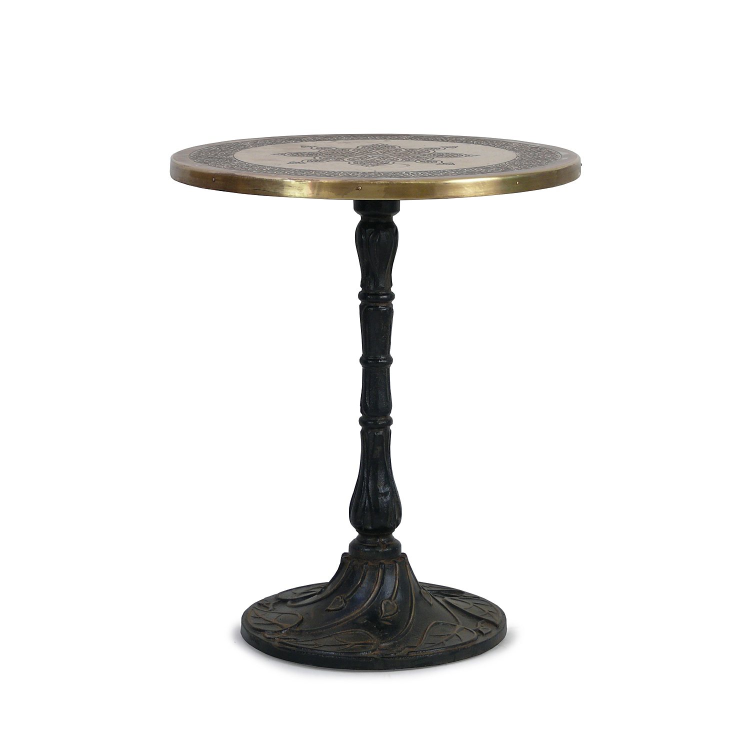 MOROCCAN CAFE TABLE CIRCULAR ENGRAVED BRASS TOP WITH CAST IRON BASE 74 CM HIGH 60 CM DIAM (ALSO AVAILABLE WITH PLAIN OAK TOP)