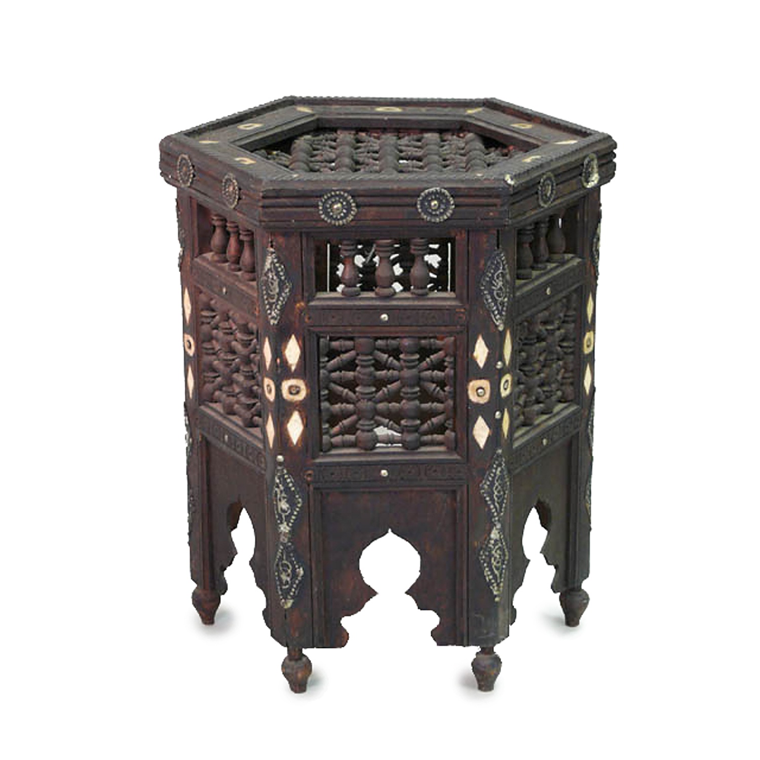 MOROCCAN TABLE LOW SIX SIDED INLAID DARKWOOD WITH FRETTED SIDES 50 CM HIGH 37 CM WIDE 37 CM DEEP(X4)