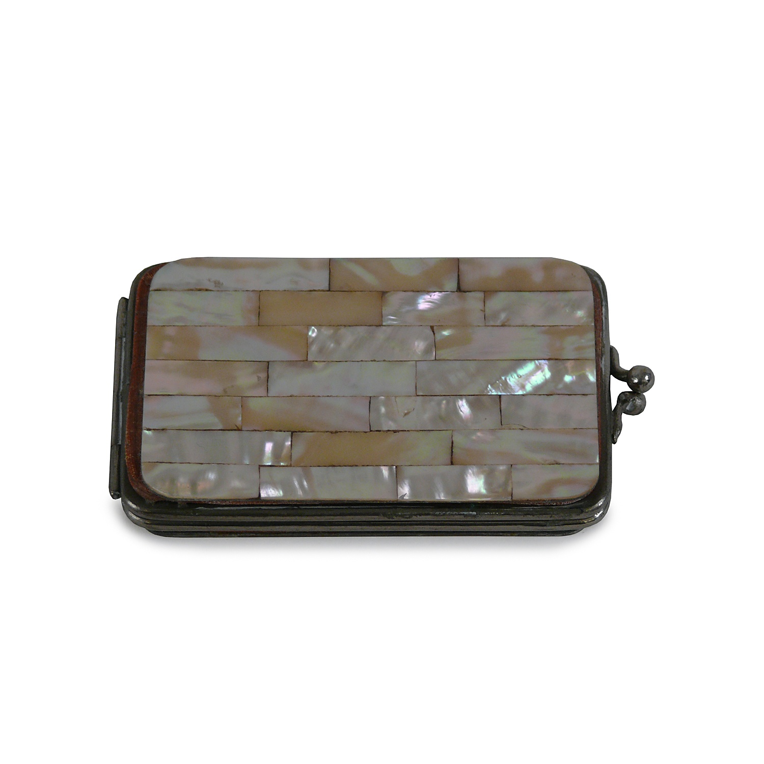MOTHER OF PEARL COVERED CARD CASE / PURSE WITH BLUE SILK INTERIOR