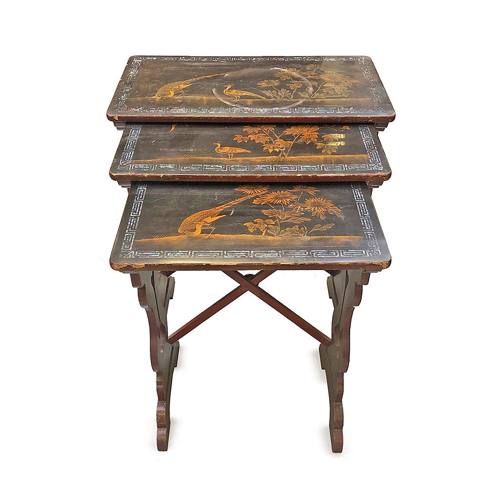 NEST OF THREE CHINESE TABLES BLACK LACQUER WITH MOTHER OF PEARL INLAID TOPS RED LACQUER FRETTED SIDES 19TH CENT THE LARGEST 64 CM HIGH 66 CM WIDE 36 CM DEEP