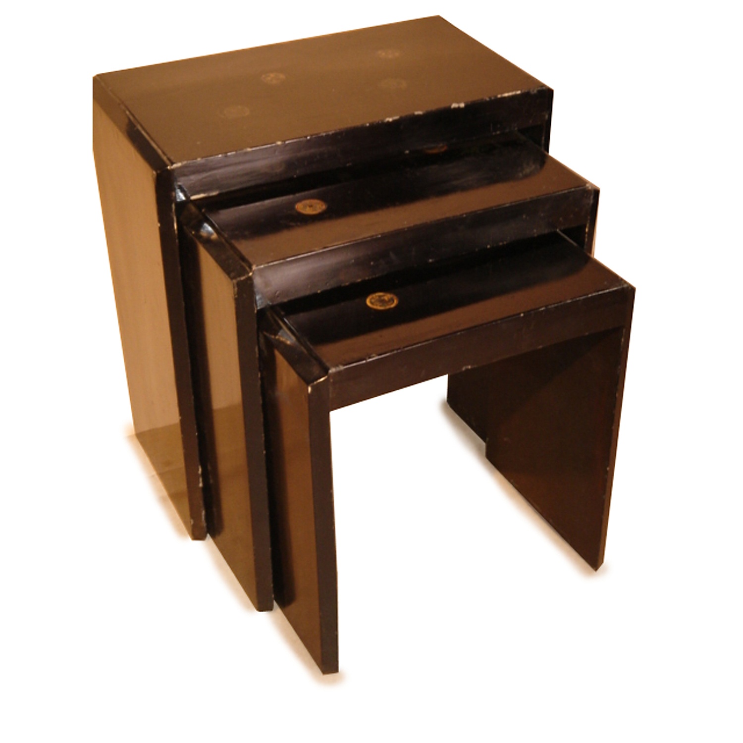 NEST OF THREE JAPANESE BLACK LACQUER LOW TABLESLARGEST 53 CM HIGH 50 CM WIDE 27 CM DEEP (X2)