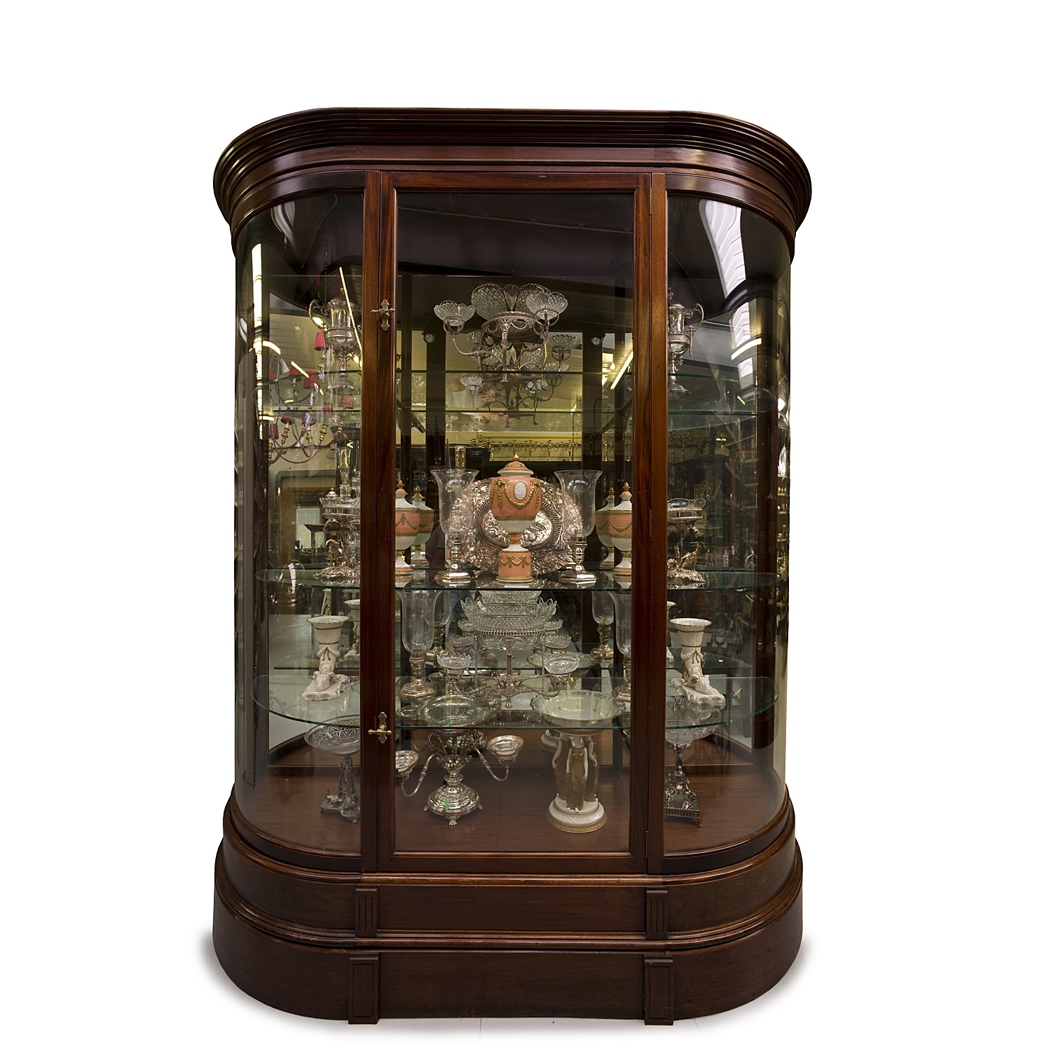 ***NOT FOR HIRE*** LARGE MAHOGANY SHOP DISPLAY CASE CABINET WITH BOWED GLASS ENDS AND GLASS SHELVES (X2) (NOT FOR HIRE)