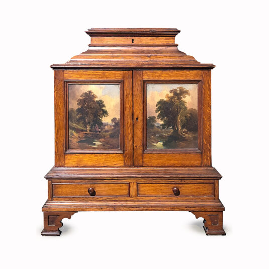 OAK BOX / TABLE CABINET WITH PAINTED DOOR PANELS AND STEPPED TOP ENGLISH CIRCA 1860 47 CM HIGH 40 CM WIDE 24 CM DEEP