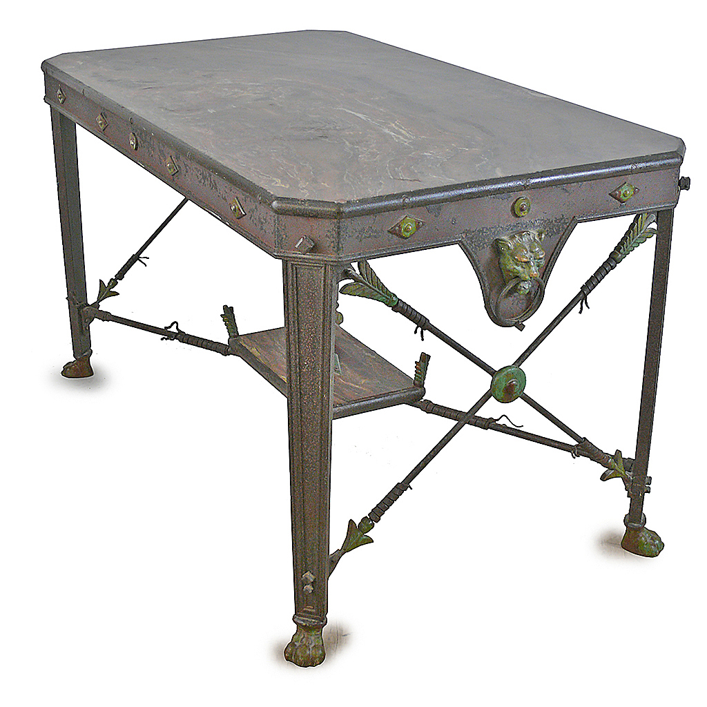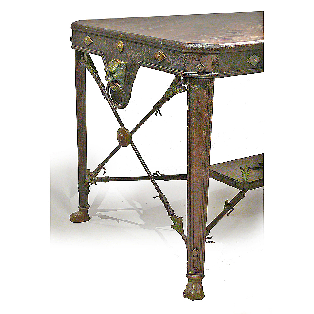 OBLONG ROMAN STYLE TABLE TWO TIER WROUGHT IRON CANTED CORNERS BRONZE LION AND ARROW MOUNTS WITH RED CAMPAN GIROTTE MARBLE TOP 79 CM HIGH 139 CM LONG 80 CM WIDE (X2)