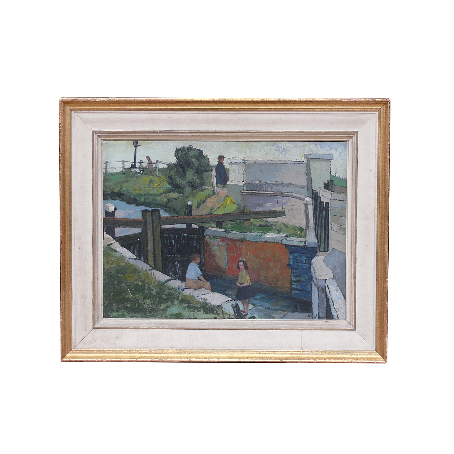OIL ON BOARD 17/i X 23.5/i 1960'S ENGLISH LANDSCAPE WITH CHILDREN AT A CANAL LOCK GATE IN 3/i GILT AND CANVAS FRAME