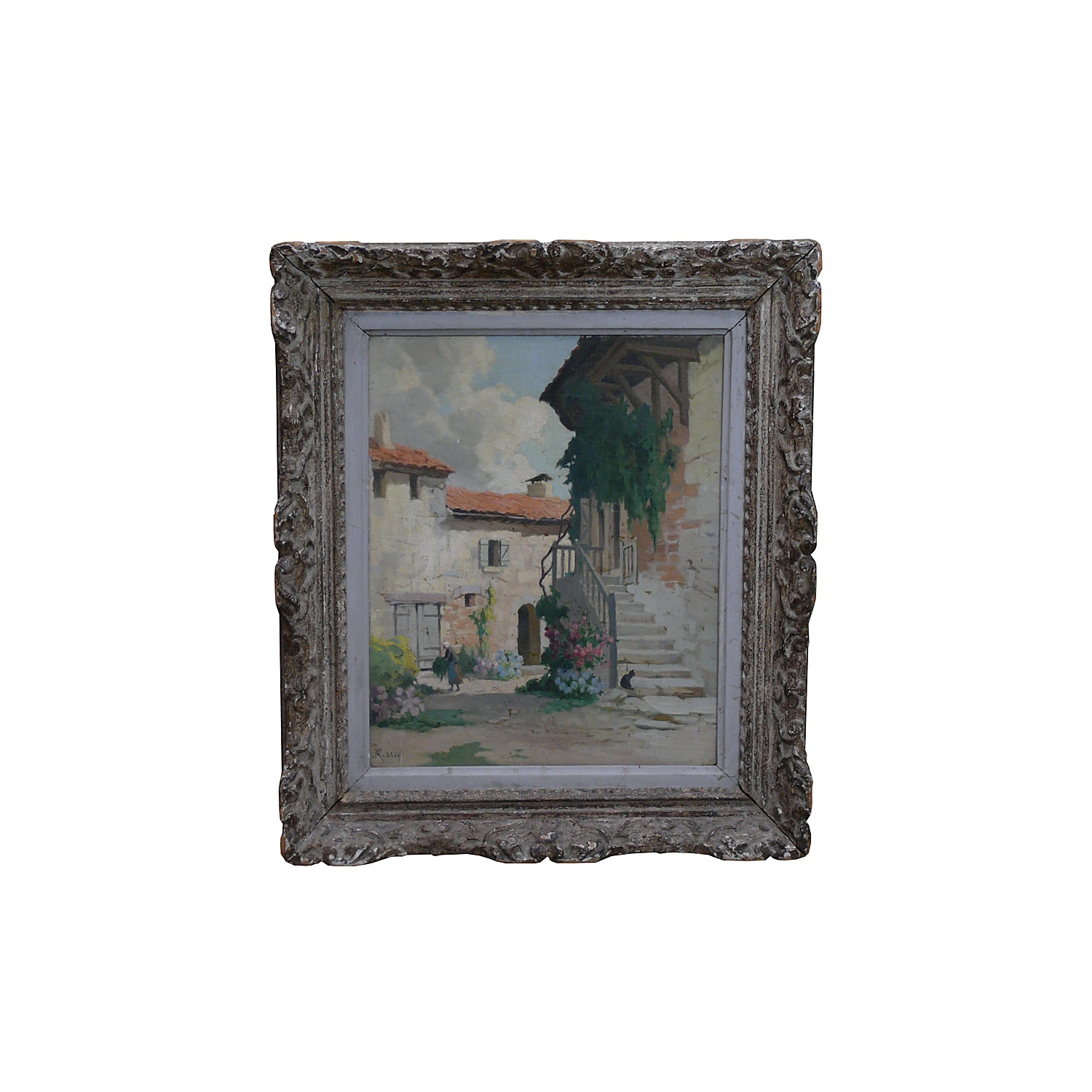 OIL ON BOARD 18/i X 15/i 20THC FRENCH COURTYARD WITH A CAT SIGNED ROBBINS IN A CORNER AND CENTRE DARK BISCUIT FRAME