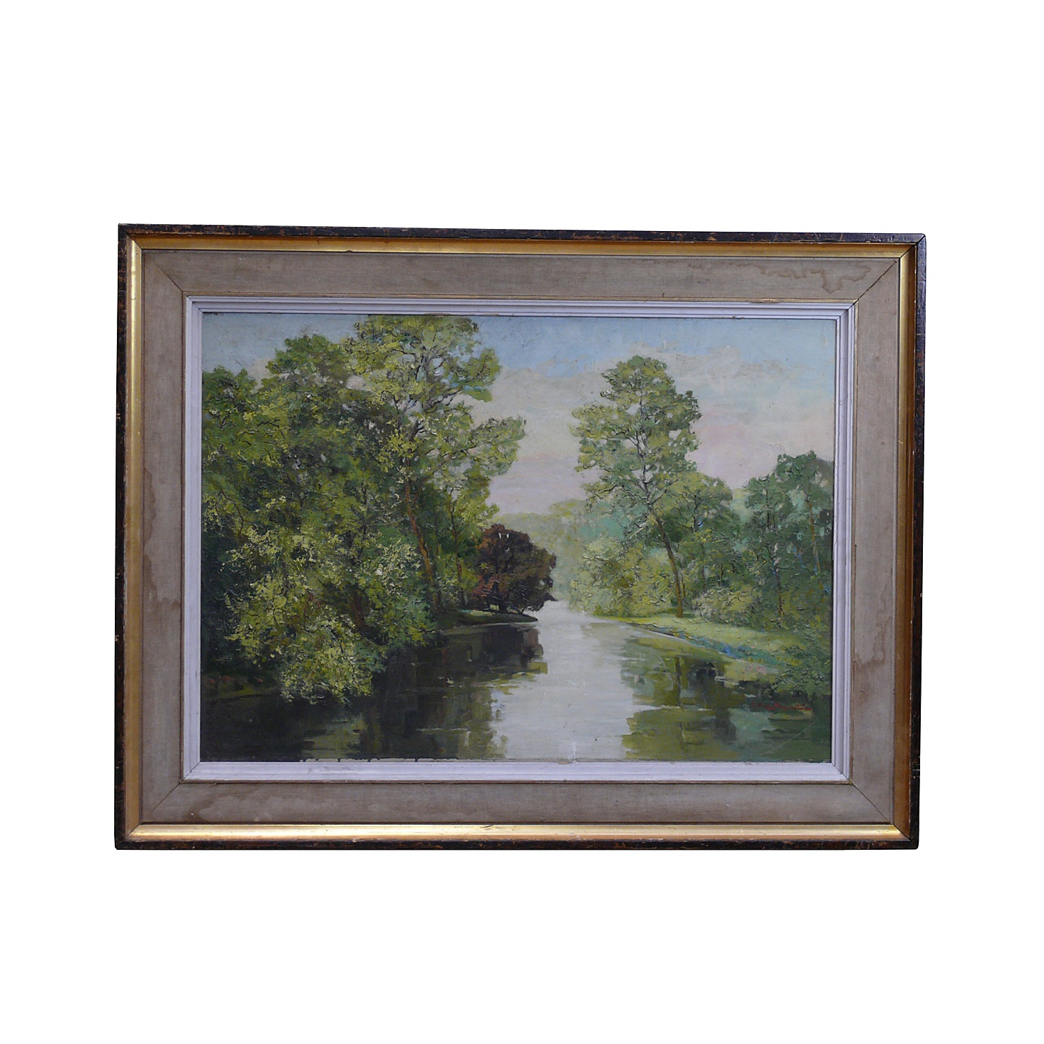 OIL ON BOARD 22 /i X 31.5 /i ENGLISH RIVER SCENE IN A 1950'S WOOD GILT AND CANVAS FRAME