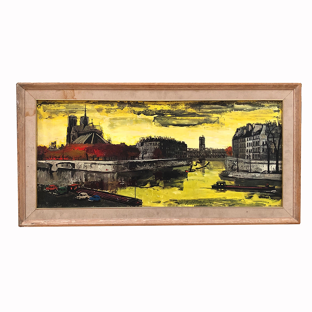 OIL ON BOARD VIEW OF NOTRE DAME DE PARIS C1960 IN A 3 PERIOD GILT FRAME 17 X 39
