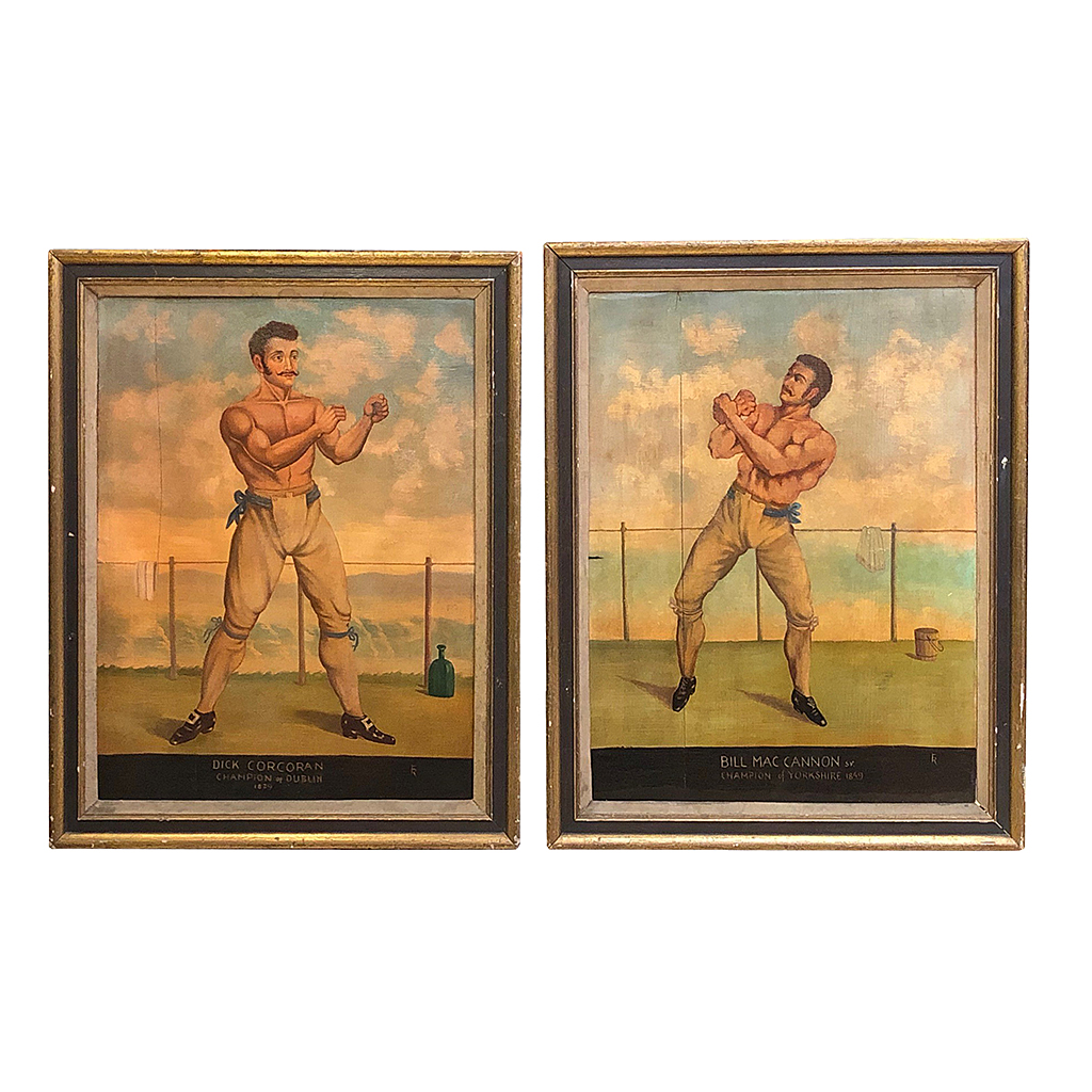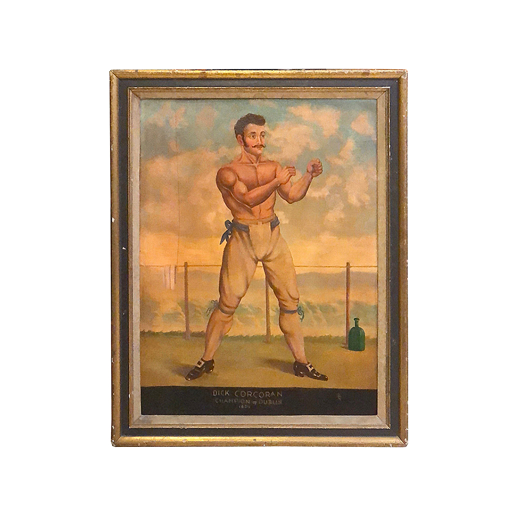 OIL ON PANEL NAIVE PORTRAIT OF A PRIZEFIGHTER / BOXER DICK CORCORAN IN A 1960'S FRAME 23" X 17"