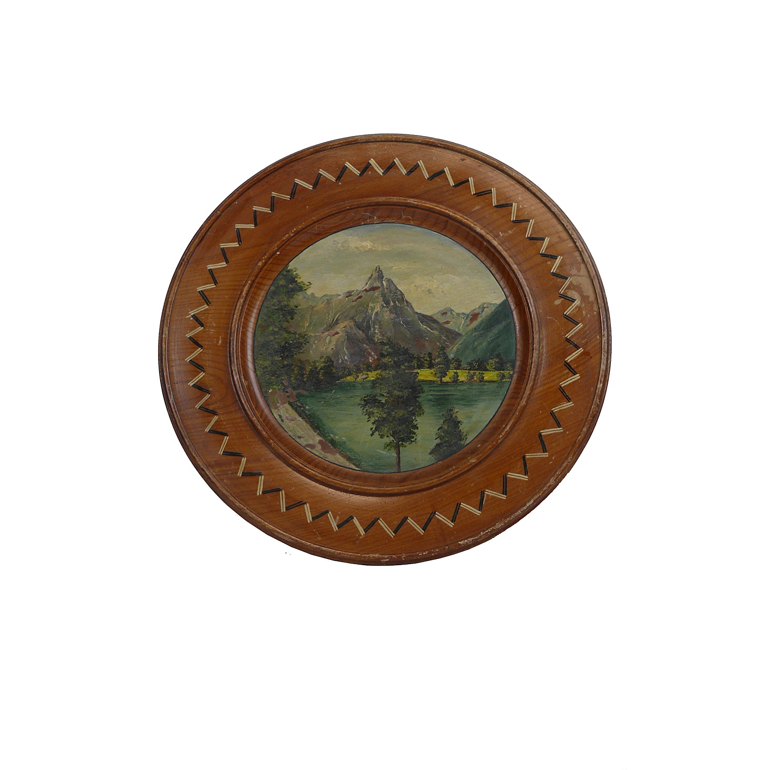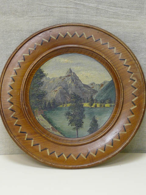 OIL ON WOOD 7.5/i X 7.5/i CIRCULAR SUMMER ALPINE LANDSCAPE IN A PAINTED LIGHT OAK PLATE