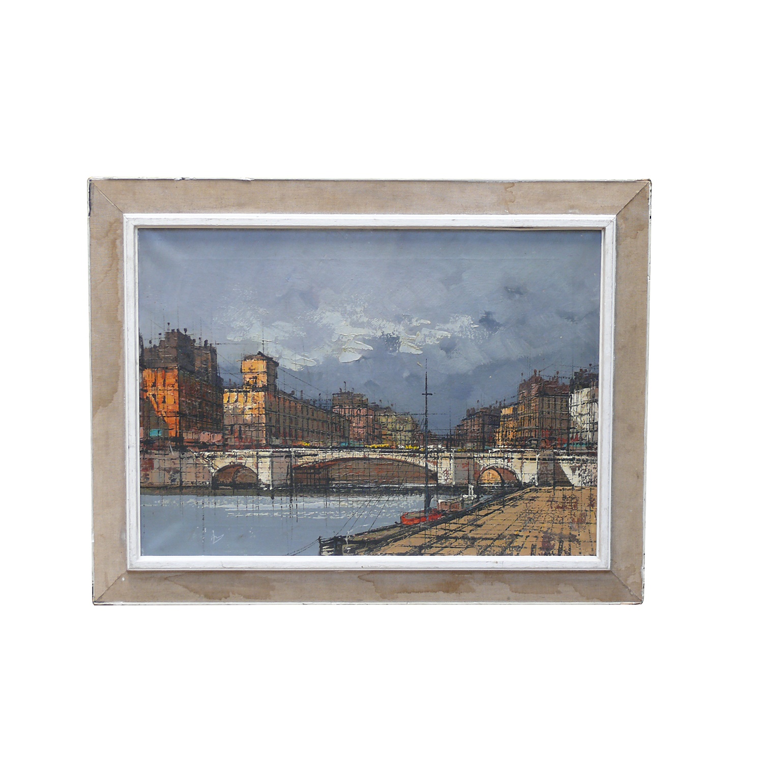 OIL PAINTING 20/i X 28/i 1950'S PARIS RIVER SCENE WITH THE PONT NEUF IN A REVERSE WHITE WOOD & CANVAS FRAME