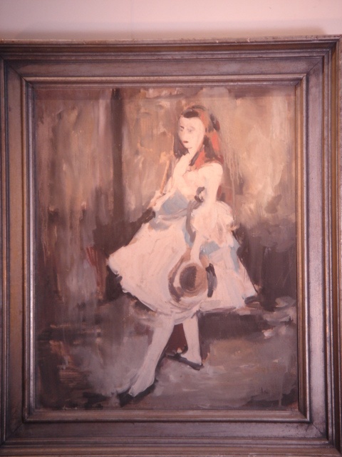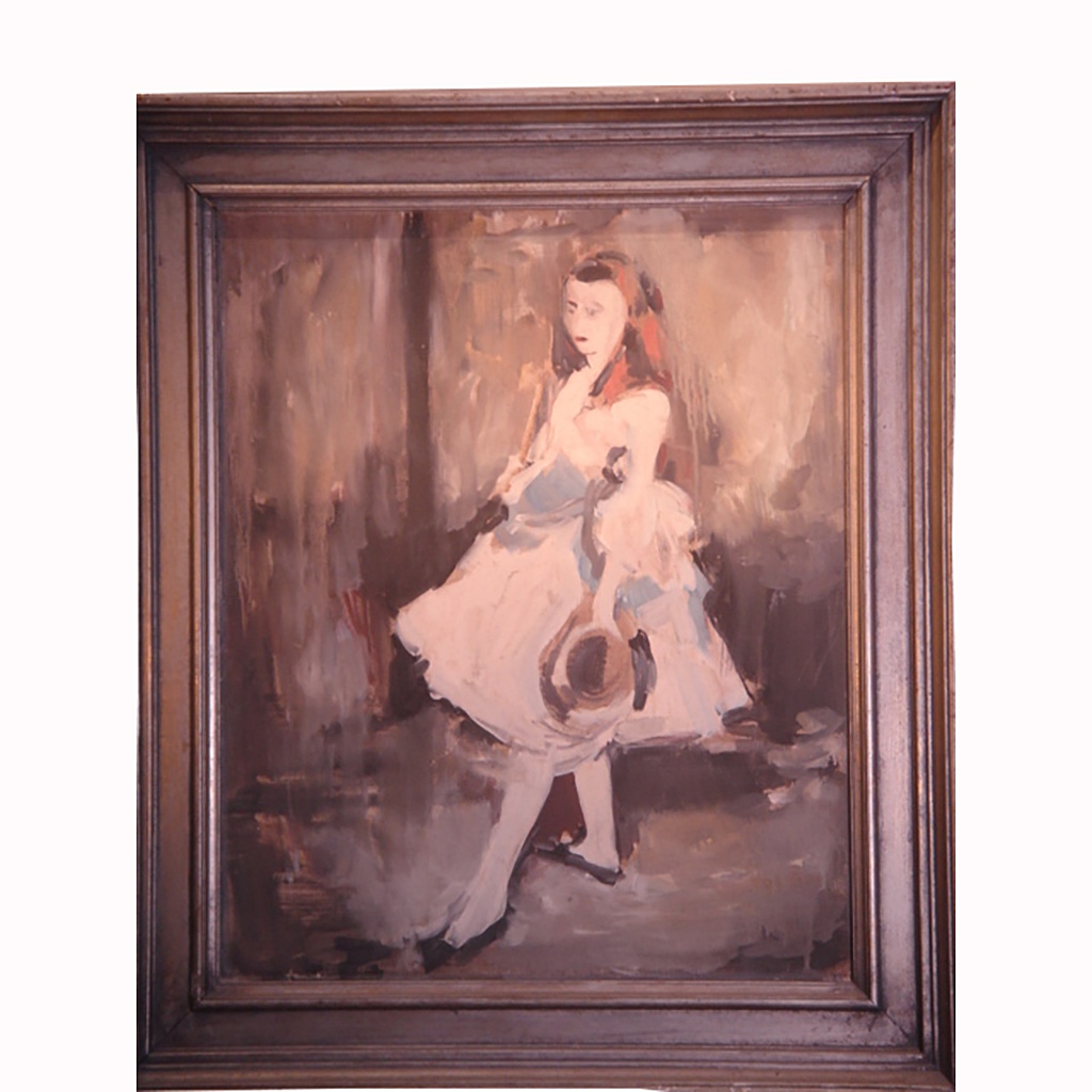 OIL PAINTING 22/i X 18/i DANCER IN THE STYLE OF WHISTLER BY JOE FARLEY IN A SILVER GILT FRAME