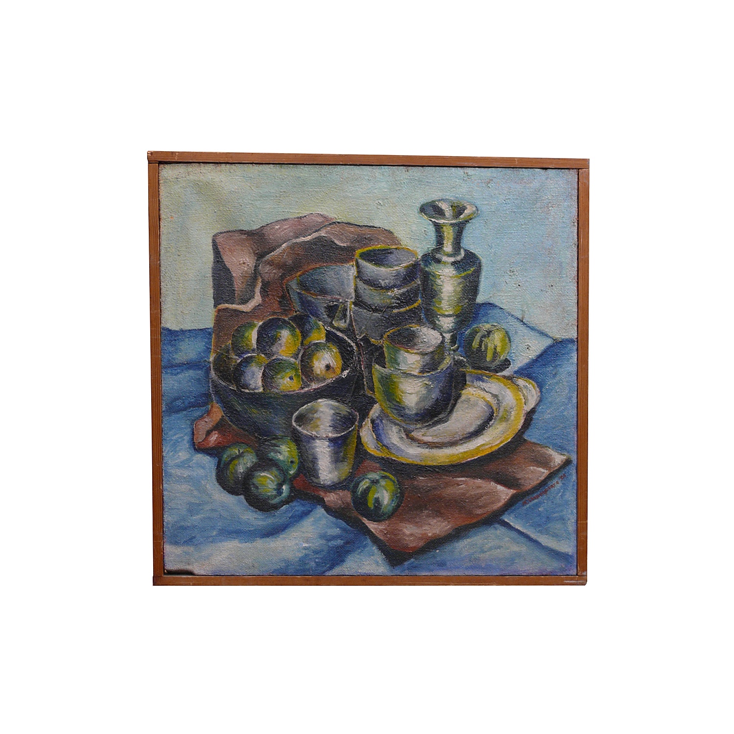 OIL PAINTING 24.5/i X 24.5/i STILL LIFE WITH FRUIT IN A LIGHT OAK FRAME
