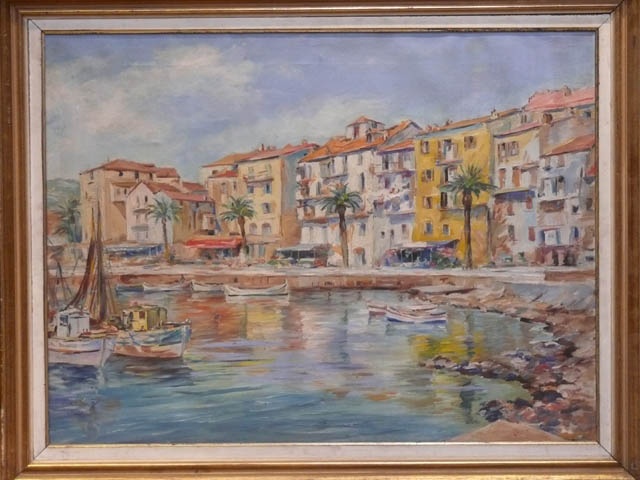 OIL PAINTING 24 /i X 32 /i 1950'S MEDITERRANEAN FISHING VILLAGE IN A GILT FRAME WITH A CANVAS SLIP