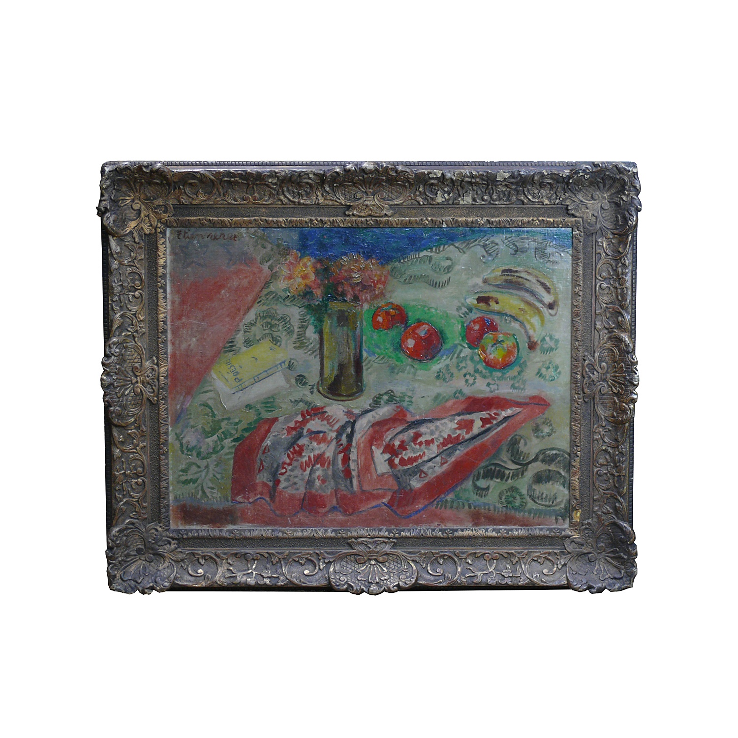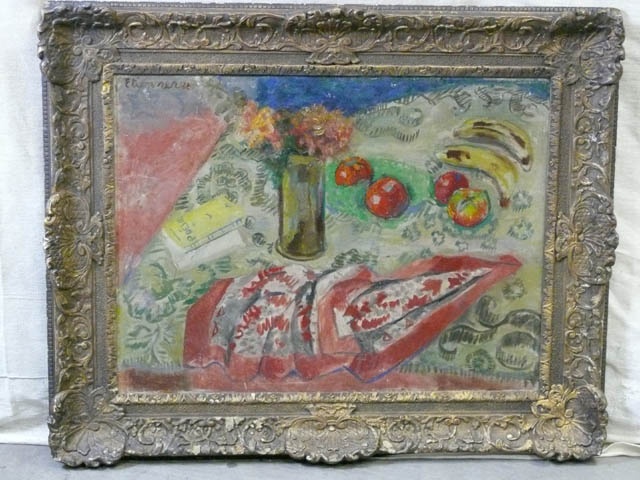 OIL PAINTING 24/i X 32/i IMPRESSIONIST STILL LIFE WITH FRUIT FLOWERS AND BOOK OF POETRY IN A HEAVY GILT CORNER AND CENTRE FRAME