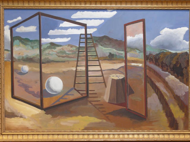 OIL PAINTING 24 /i X 36 /i COPY OF A PAUL NASH SURREALIST LANDSCAPE IN A GILT FLUTED FRAME