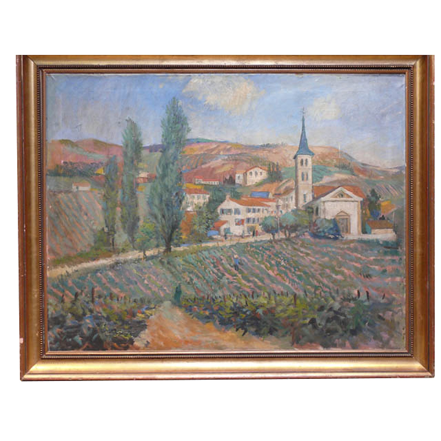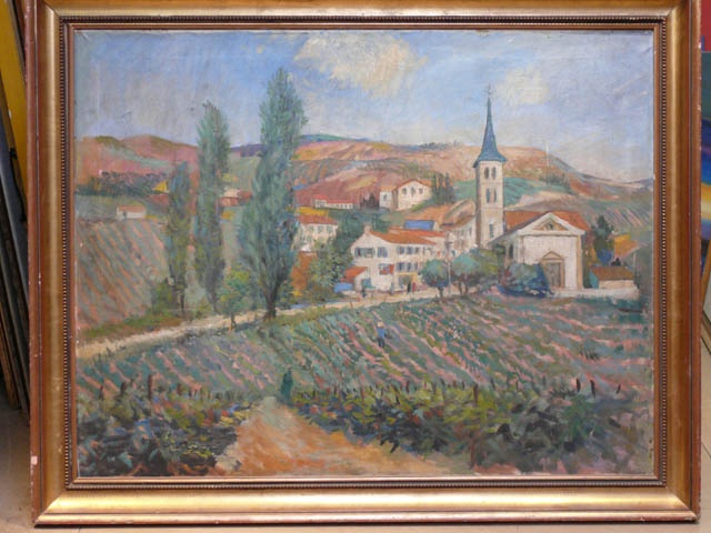OIL PAINTING 27.5 /i X 35.5 /i 1960'S IMPRESSIONIST STYLE FRENCH LANDSCAPE VINEYARD WITH STEEPLE IN GILT HOLLOW FRAME