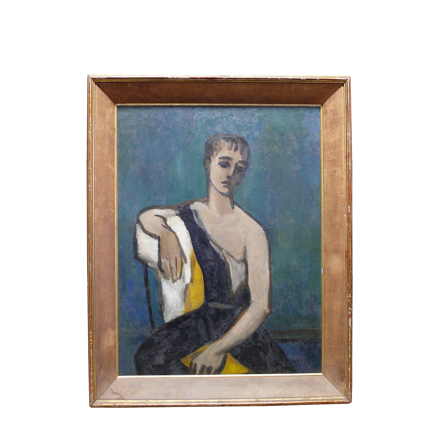 OIL PAINTING 34 /i X 26 /i SEATED YOUTH IN THE STYLE OF BLUE PERIOD PICASSO SIGNED AND DATED HEIN HECKROTH (1901-1970 GER) 1960 IN A GILT AND CANVAS BOX FRAME