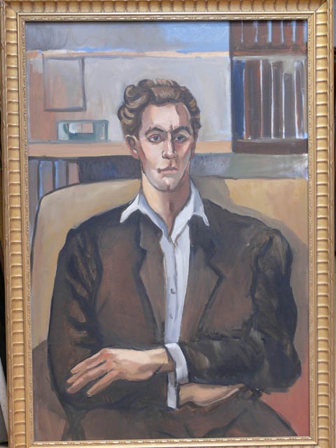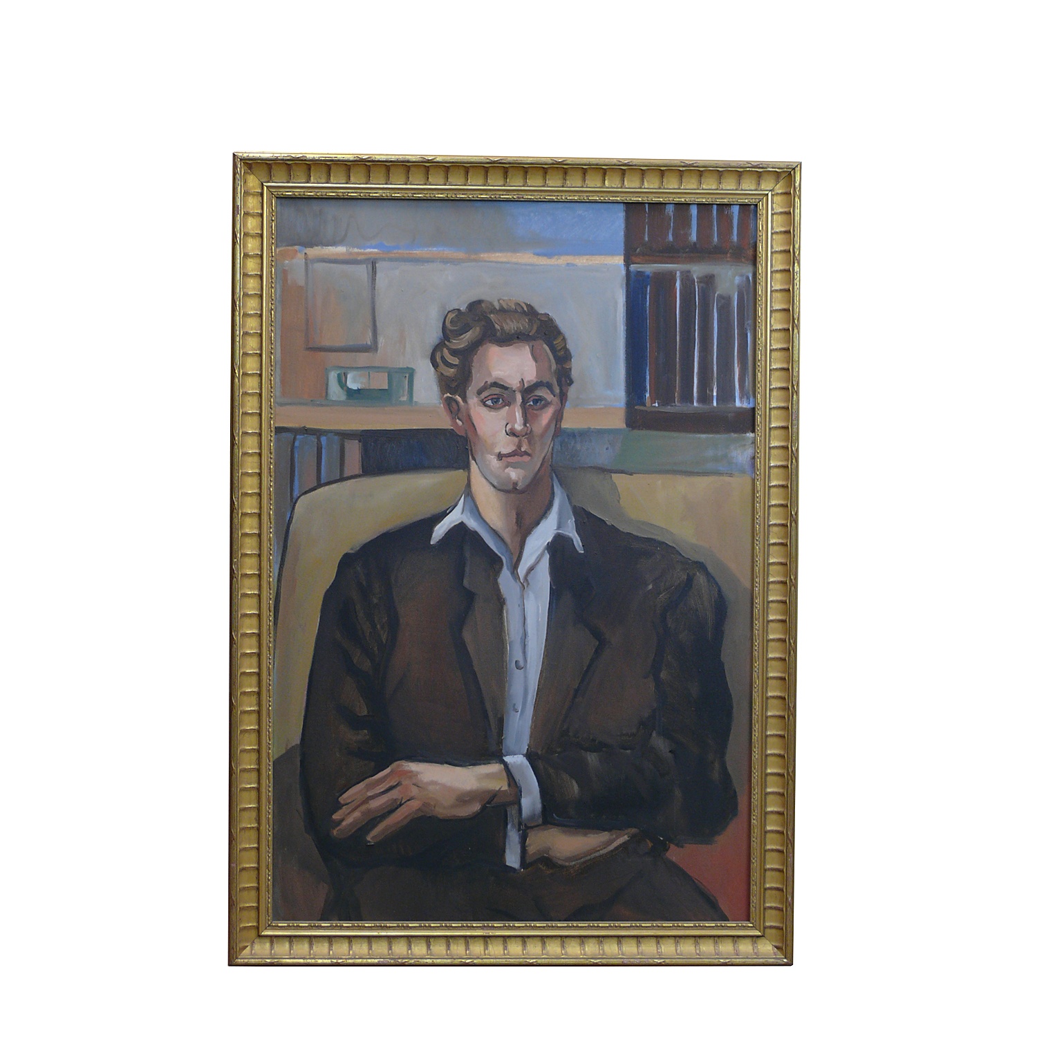 OIL PAINTING 36/i X 24/i PORTRAIT OF A YOUNG 1920'S GENTLEMAN SEATED IN LIBRARY IN A MODERN FLUTED GILT FRAME