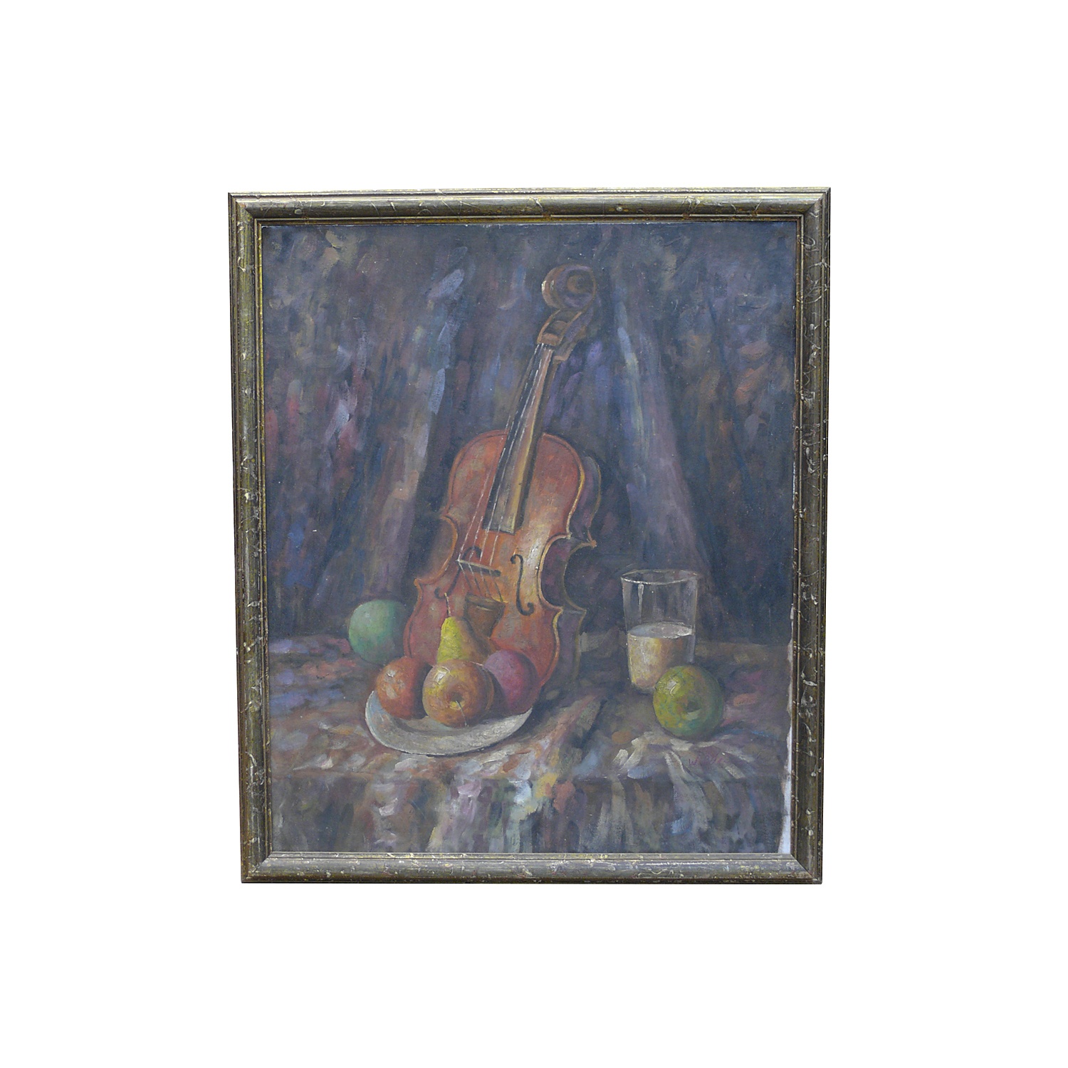 OIL PAINTING STILL LIFE WITH A VIOLIN AND FRUIT IN A SLIM PLAIN WOOD FRAME