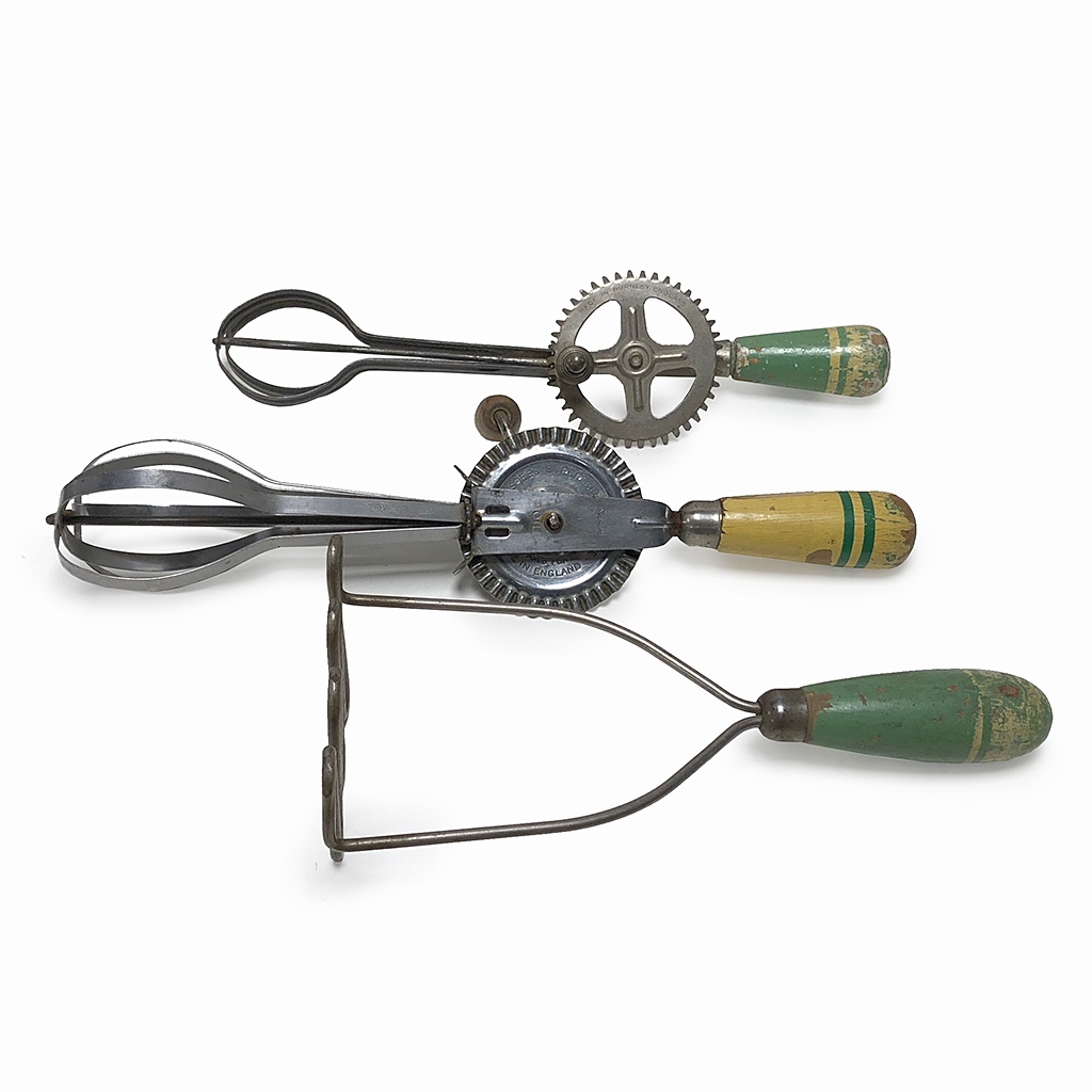 OLD KITCHEN WHISK / MASHER WITH PAINTED WOOD HANDLE AS SELECTED (X3)