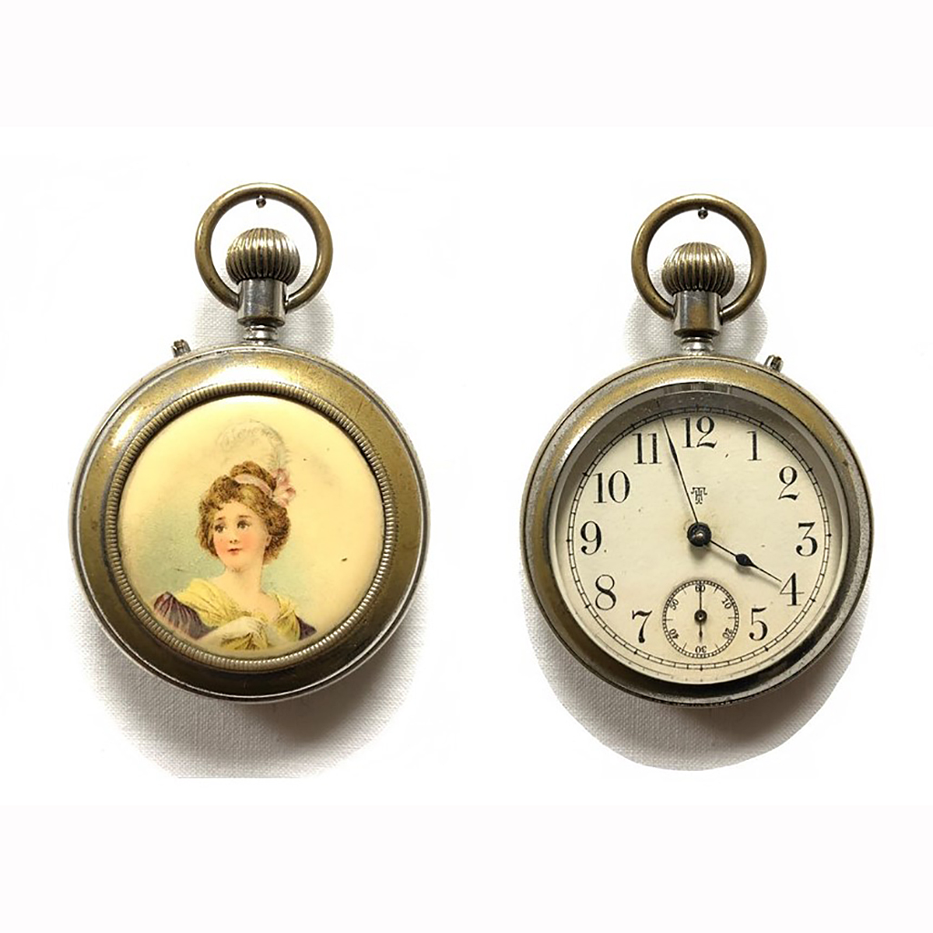 OPEN FACE GILT POCKET WATCH WITH PAINTED LADY