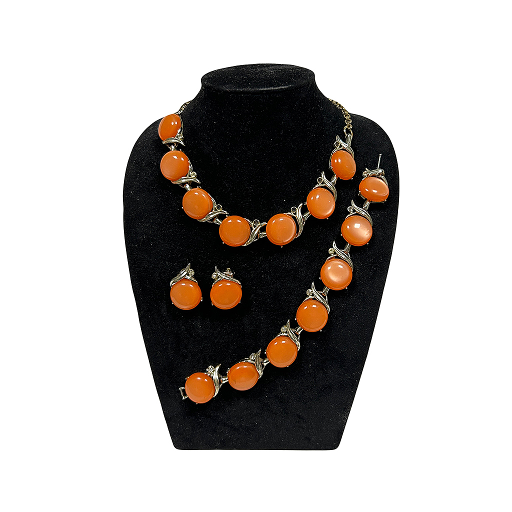 ORANGE DISCS ON GILT NECKLACE WITH MATCHING BRACELET AND EARRINGS