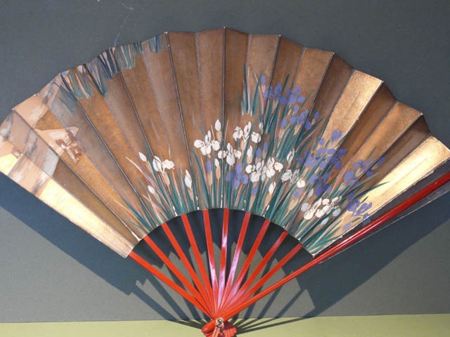 ORIENTAL GOLD HAND PAINTED FAN WITH RED LACQUER STICKS IRIS DESIGN 30 CM