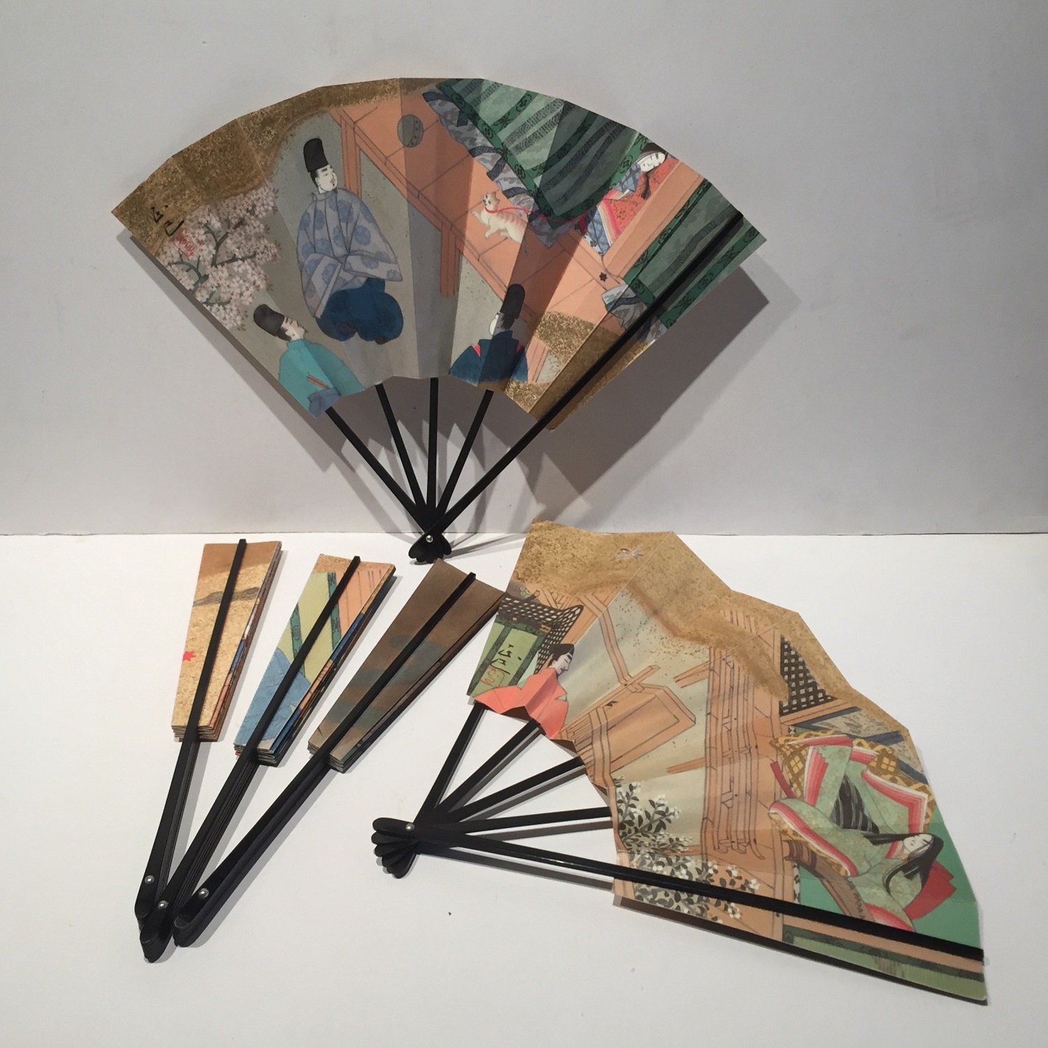 ORIENTAL PAPER FAN WITH PRINTED PICTORAL SCENES AND PAINTED WOODEN STICKS
