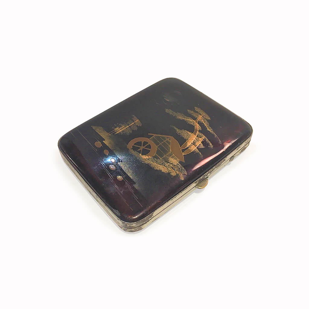 ORIENTAL STYLE FAUX TORTOISHESHELL CIGARETTE CASE WITH INLAID BRASS PICTORAL SCENE