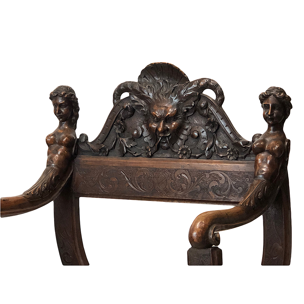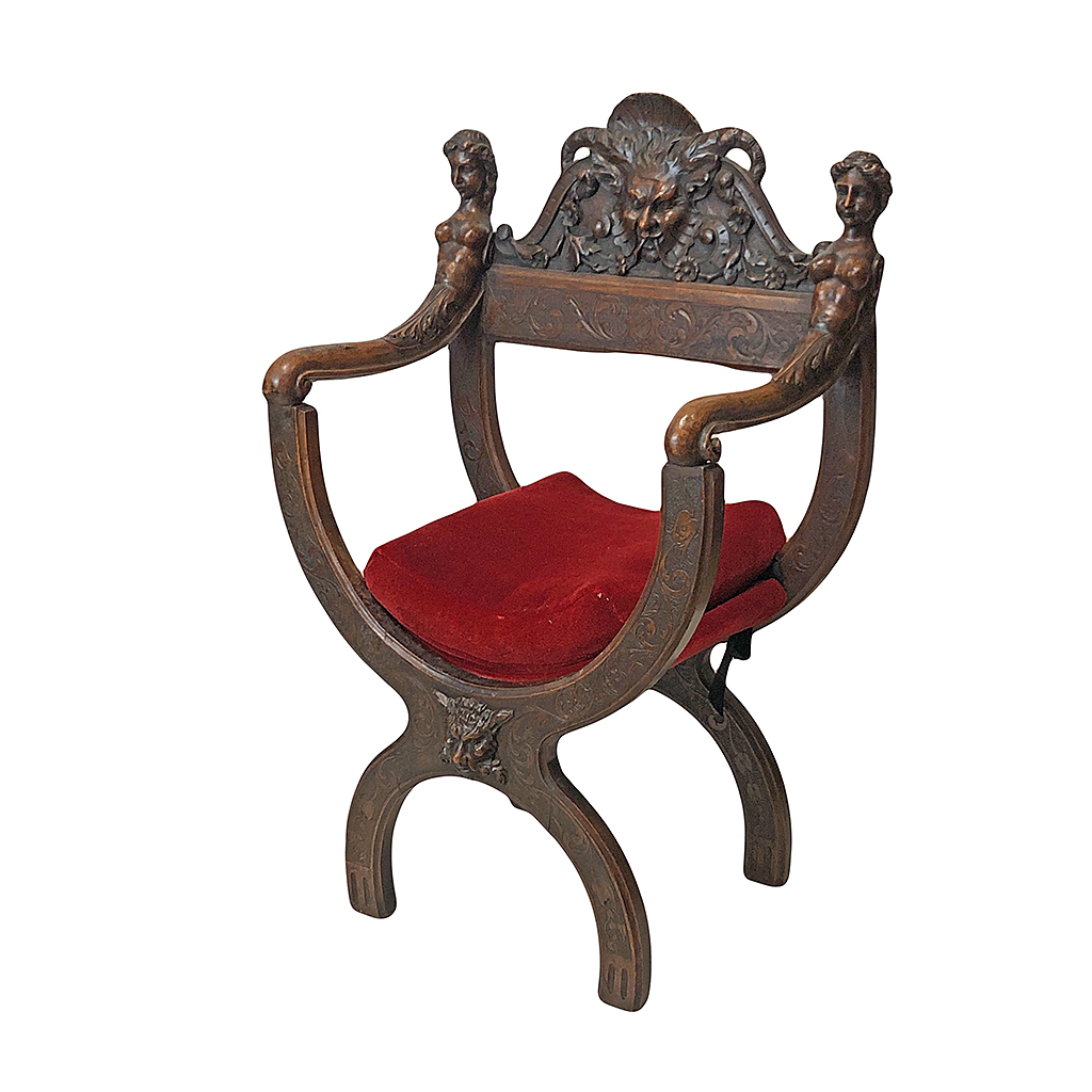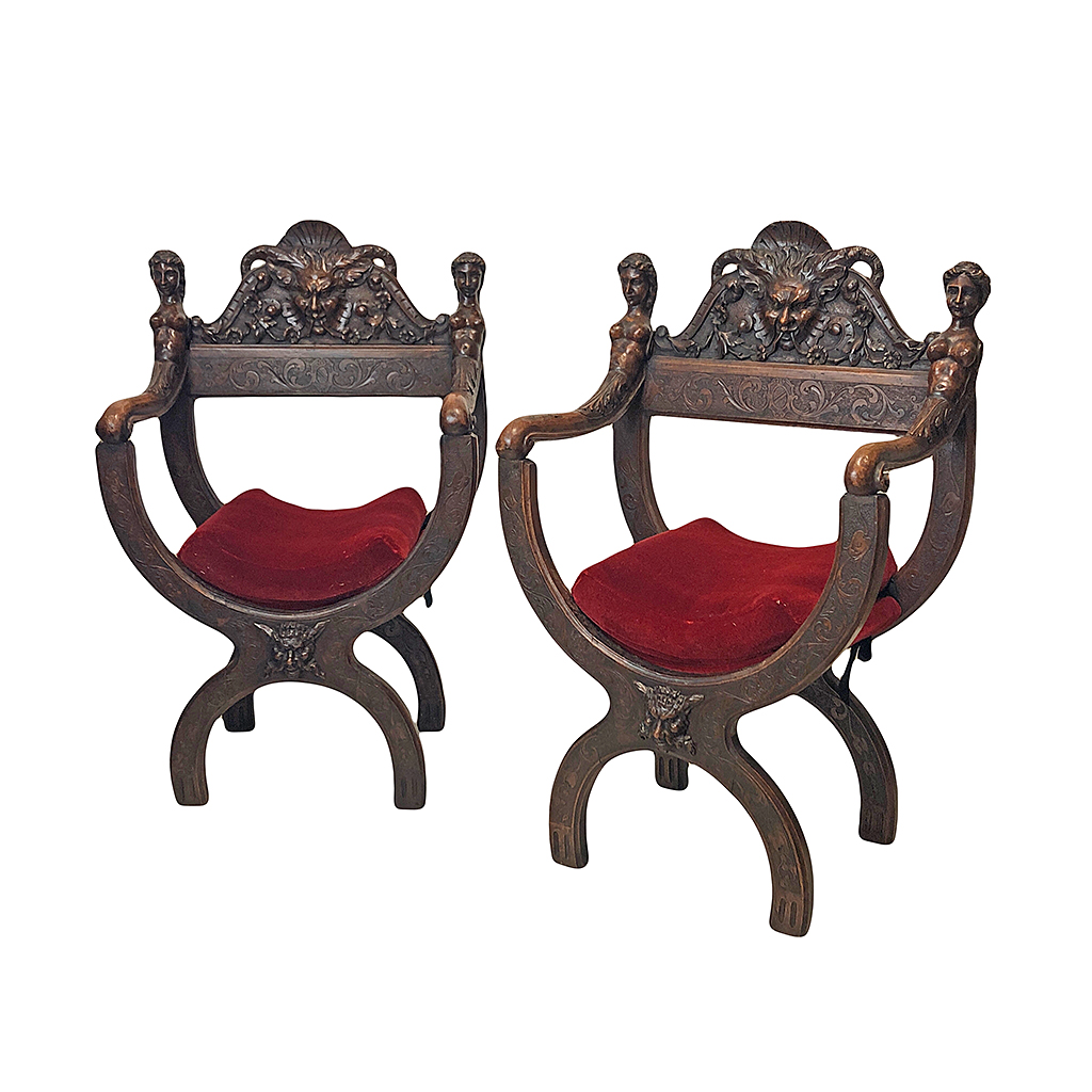 ORNATE ARM CHAIR CARVED ITALIAN RENAISSANCE STYLE X FRAME WITH SATYR HEAD BACK WITH RED VELVET SQUAB CUSHION 108 CM HIGH 67 CM WIDE 46 CM DEEP (X2)