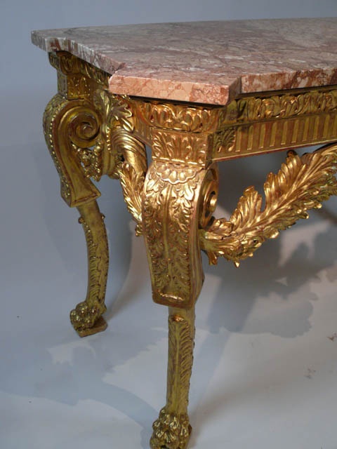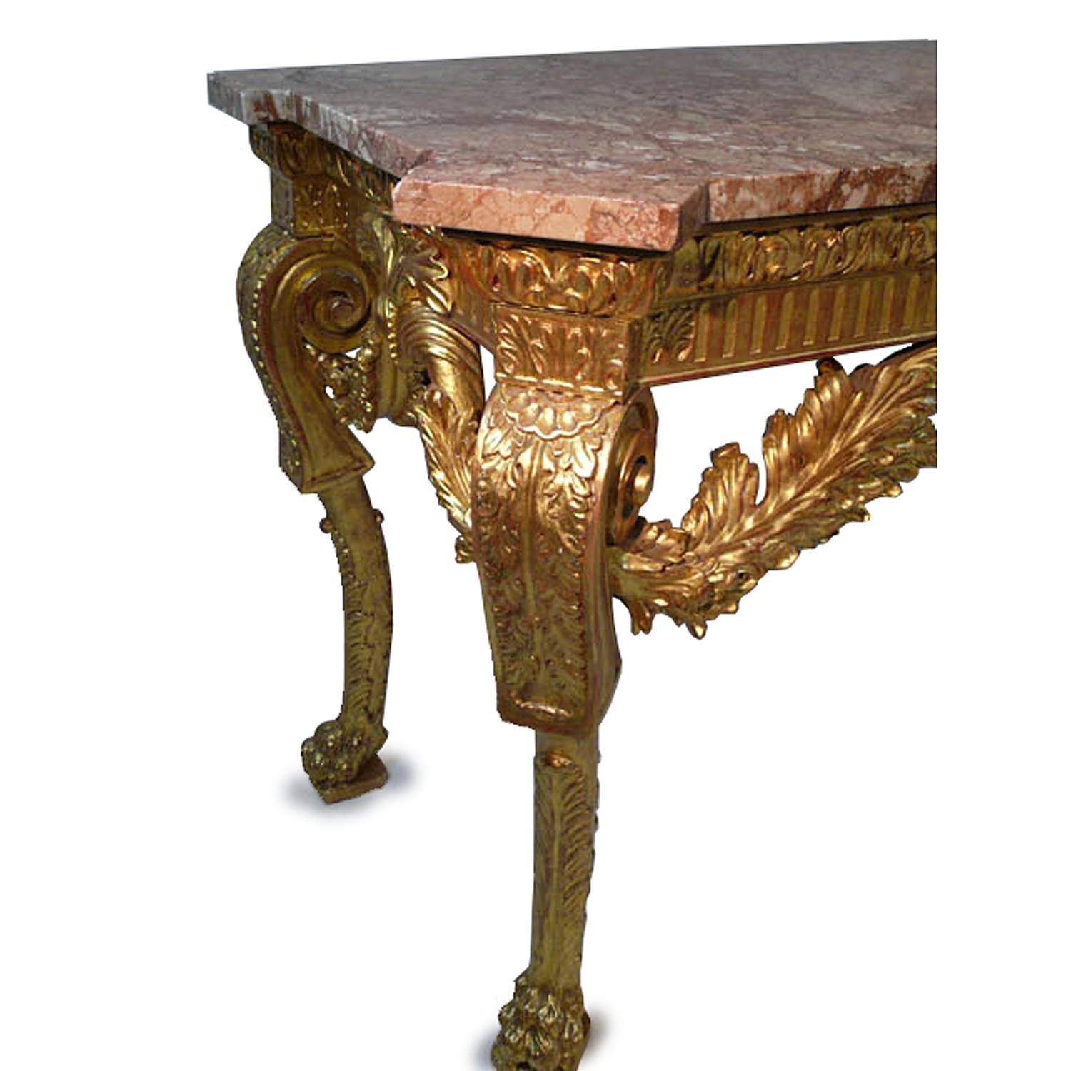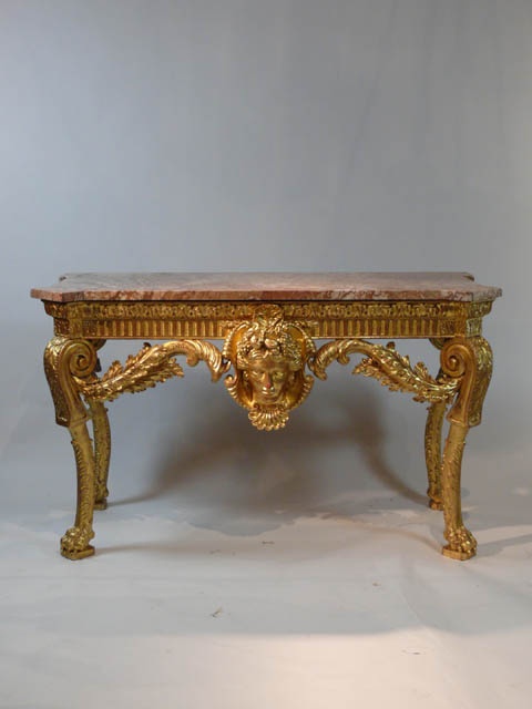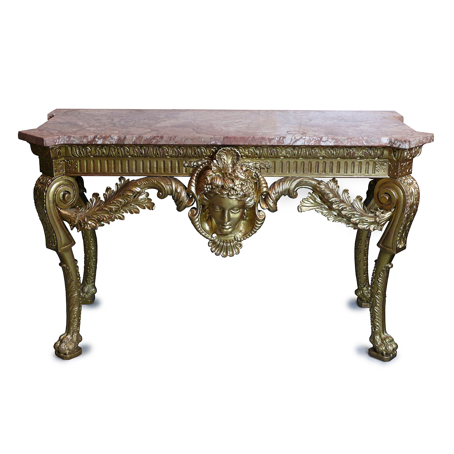 ORNATE CARVED AND GILDED GEORGIAN CONSOLE TABLE WITH FEMALE HEAD AND SHAPED PINK MARBLE TOP 2'11/i HIGH 4'10/i WIDE 2'1/i DEEP 89 CM X 150 CM X 64 CM (X2)