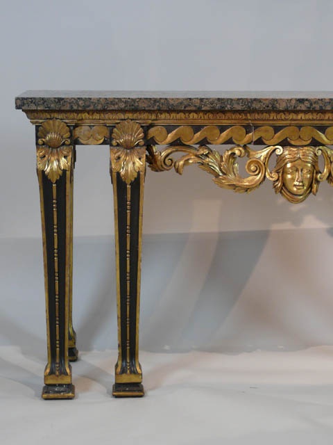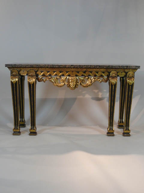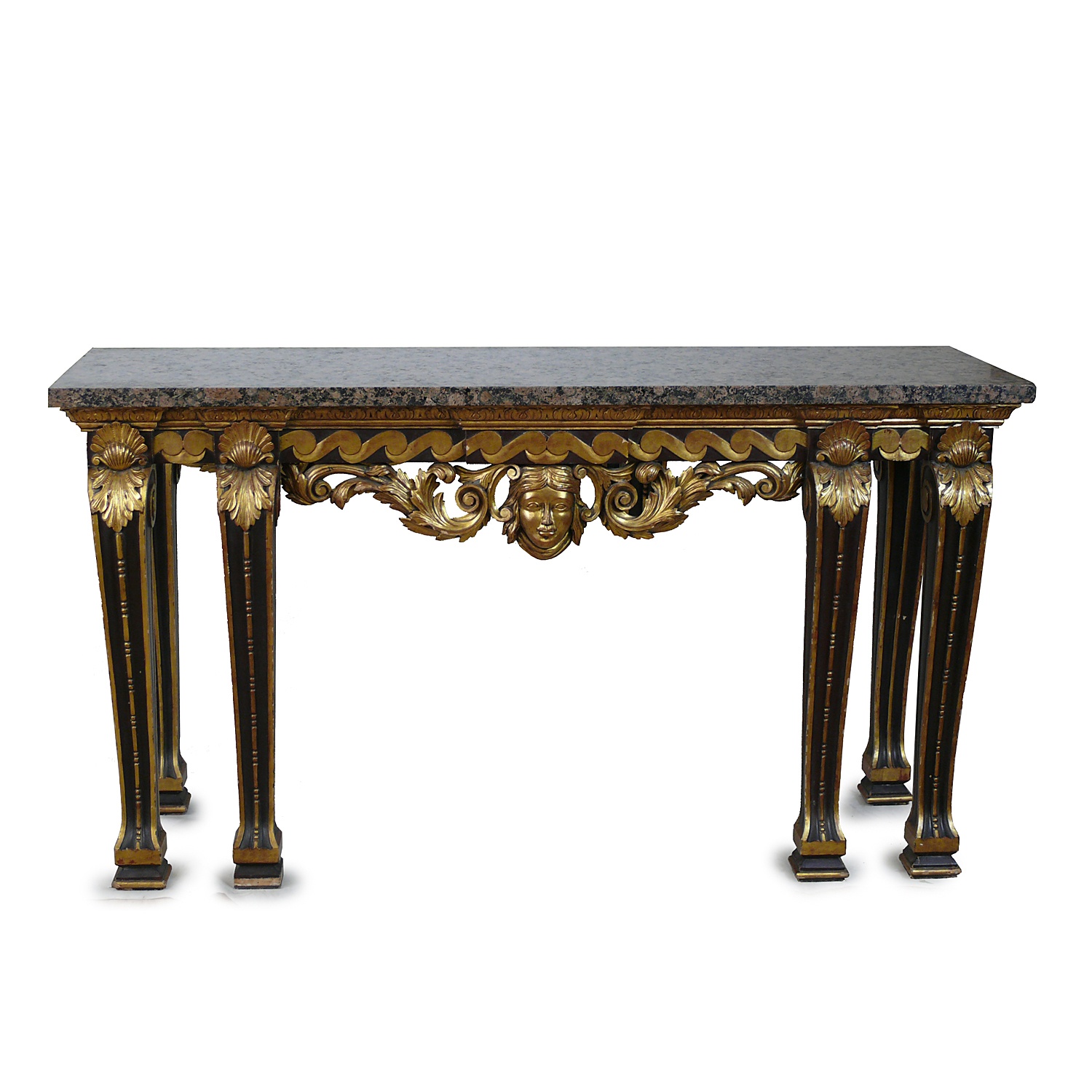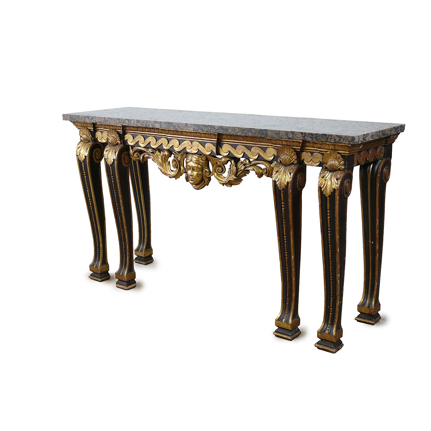 ORNATE CARVED DARK WOOD AND PARCEL GILT GEORGIAN SIX LEG CONSOLE TABLE BROWN MARBLE TOP 5' / 85 CM HIGH X 153 CM LONG X 46 CM DEEP (X2)