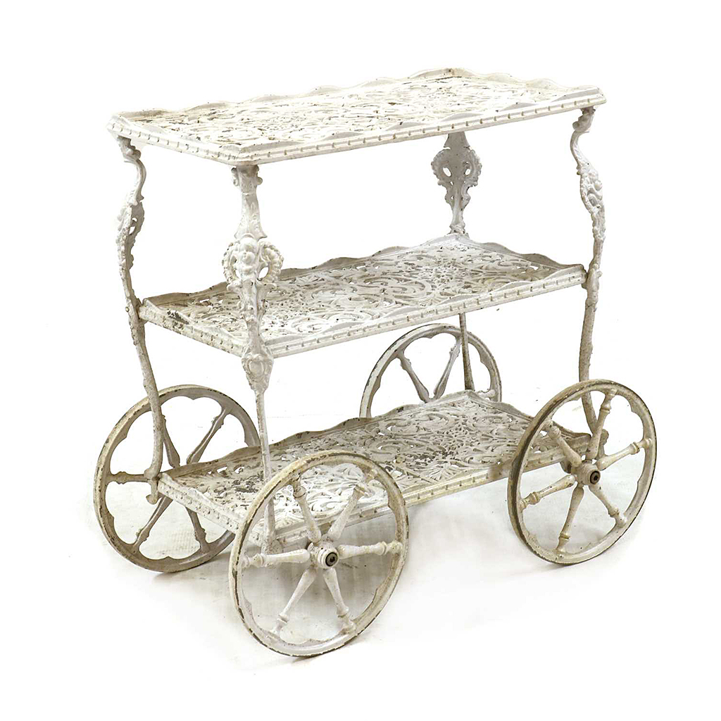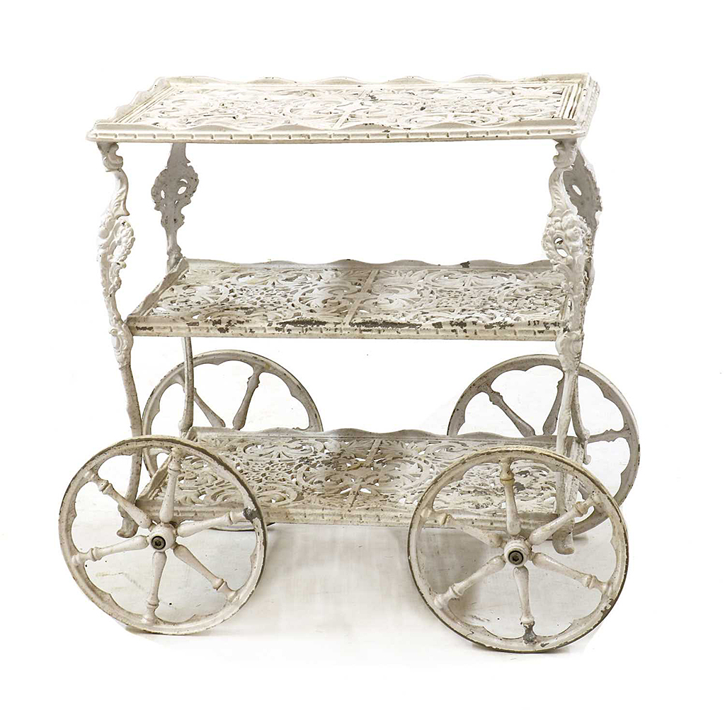 ORNATE CAST IRON GARDEN DRINKS TROLLEY THREE TIER WITH SPOKED WHEELS WHITE PAINTED VICTORIAN CIRCA 1890 70 CM HIGH 68 CM WIDE 36 CM DEEP