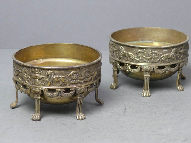 ORNATE GILT SWEET DISH WITH SIX FEET AND CLASSICAL LION RELIEF 11 CM DIAM. (X2)