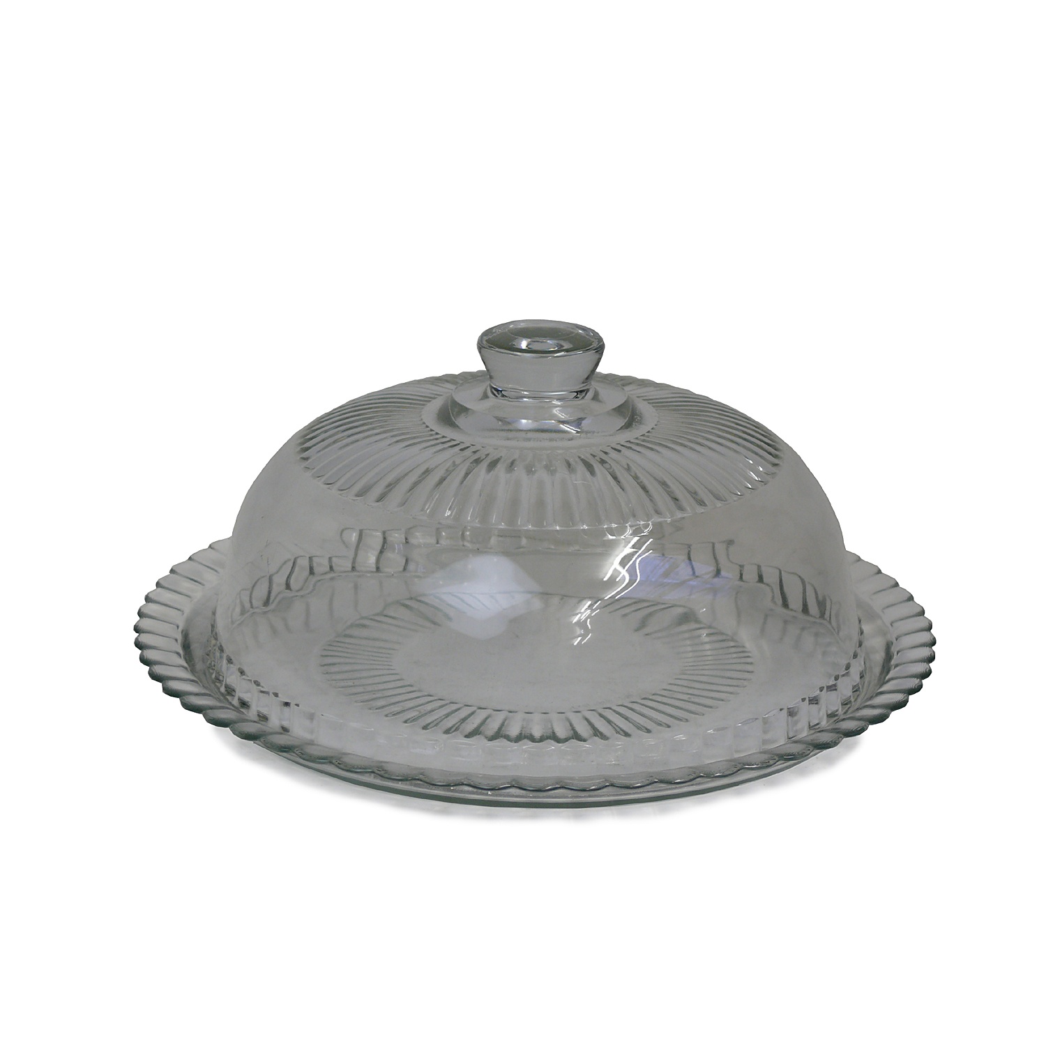 ORNATE GLASS CAKE PLATE WITH FLUTED GLASS DOME COVER 33CM DIA 17CM HIGH