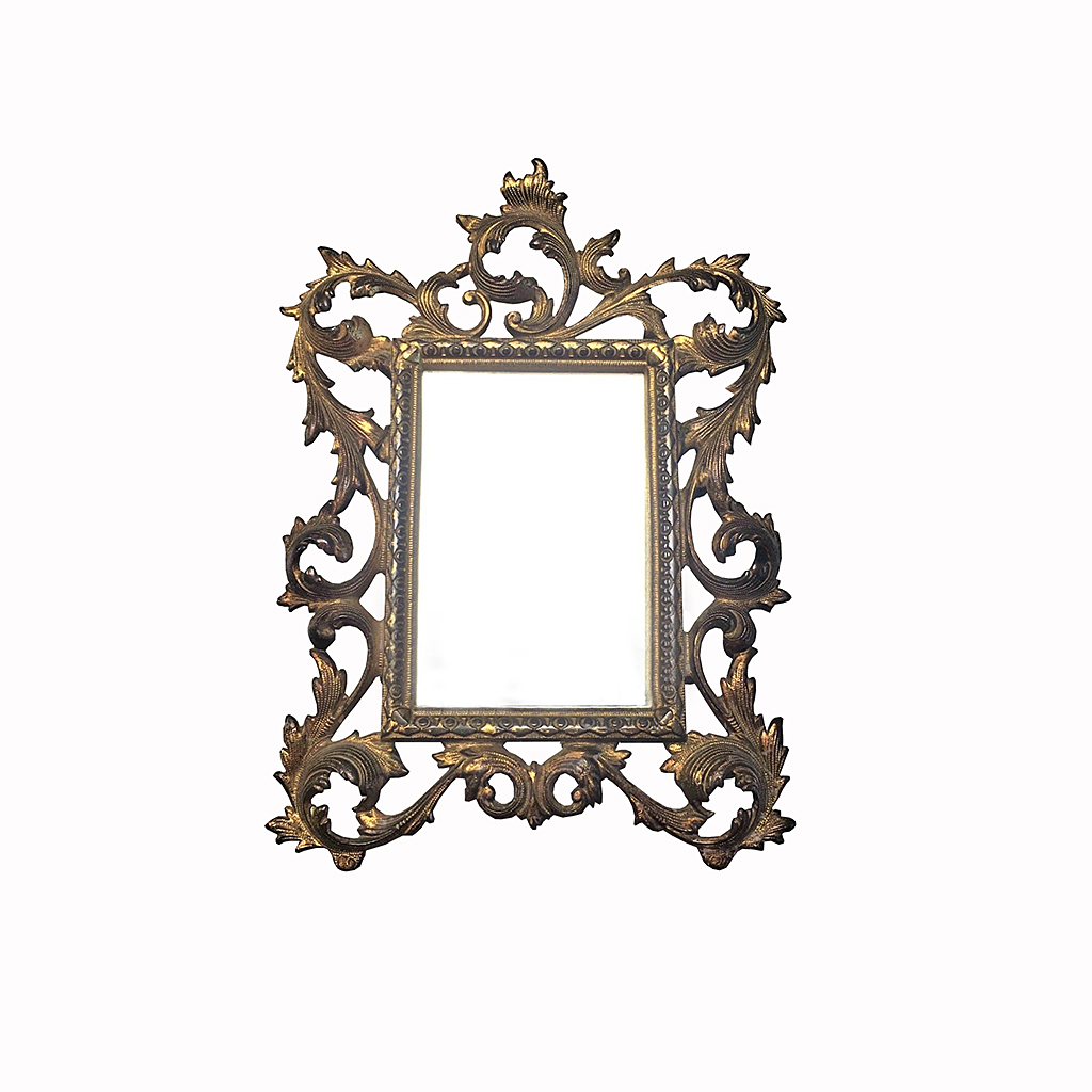 ORNATE WALL HANGING MIRROR WITH BAROQUE STYLE GILT METAL FRAME OF LEAVES AND SWIRLS 11 X 8 OVERALL SIZE