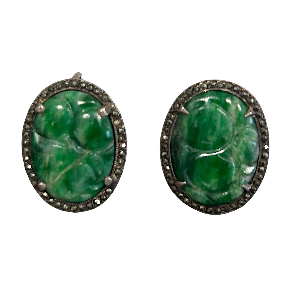 OVAL CARVED JADE EARRINGS ON SILVER AND MARCASITE SETTING