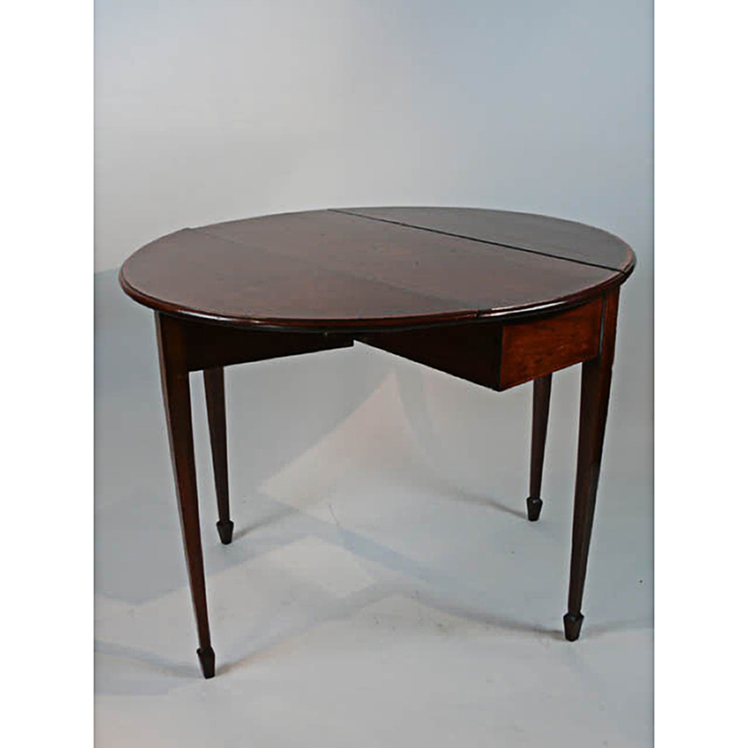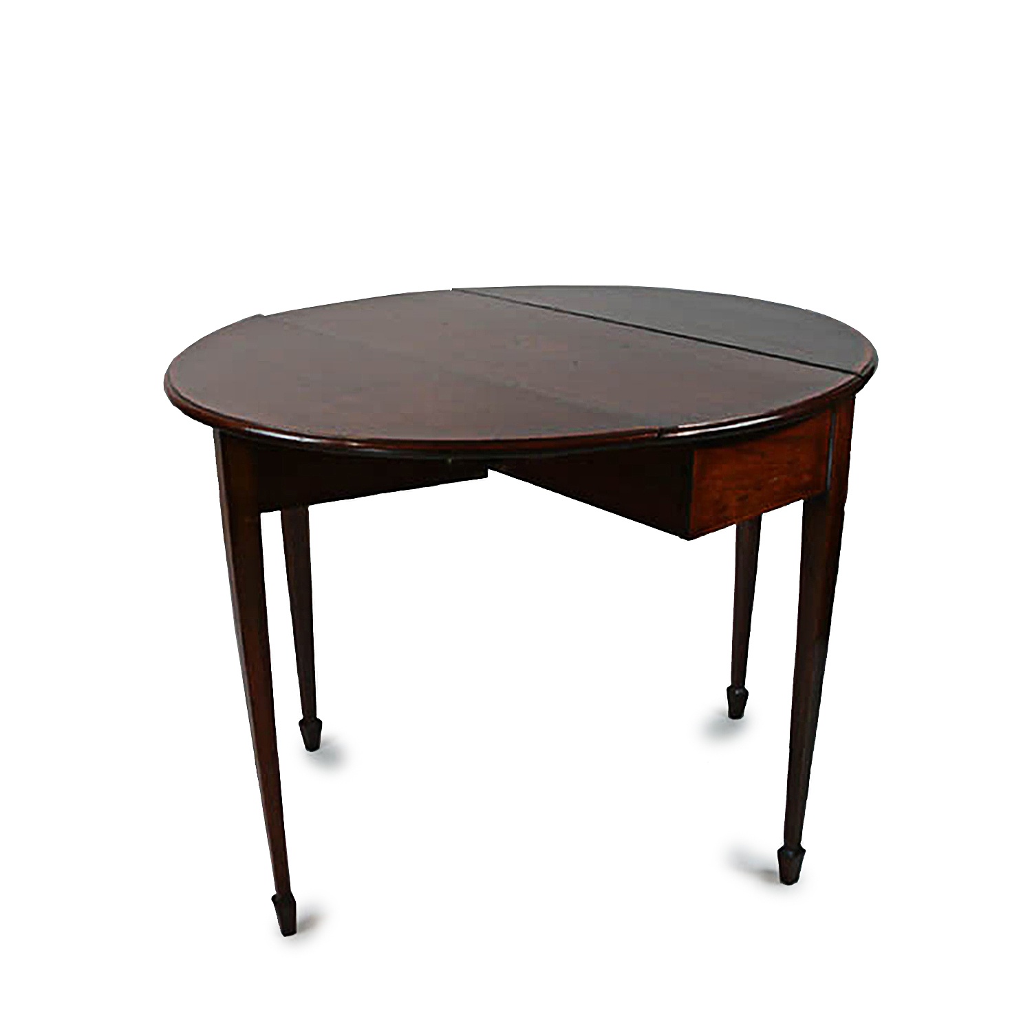 OVAL INLAID MAHOGANY PEMBROKE TABLE WITH DROP LEAF SIDES AND TAPERING LEGS SPADE FOOT 2'6/i HIGH X 3' WIDE X 3'5/i DEEP 76 CM X 92 CM X 104 CM