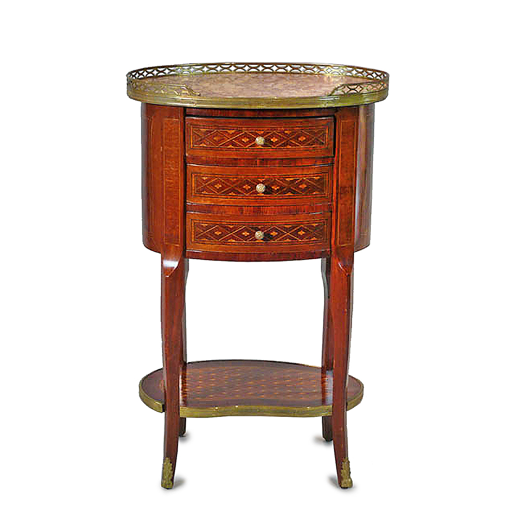 OVAL LOUIS XVI THREE DRAWER OCCASIONAL TABLE WITH CRISS CROSS MARQUETRY INLAY ORMOLU MOUNTS AND A BROWN MARBLE GALLERY EDGED TOP 75 CM HIGH 47 CM WIDE 33 CM DEEP (X2)