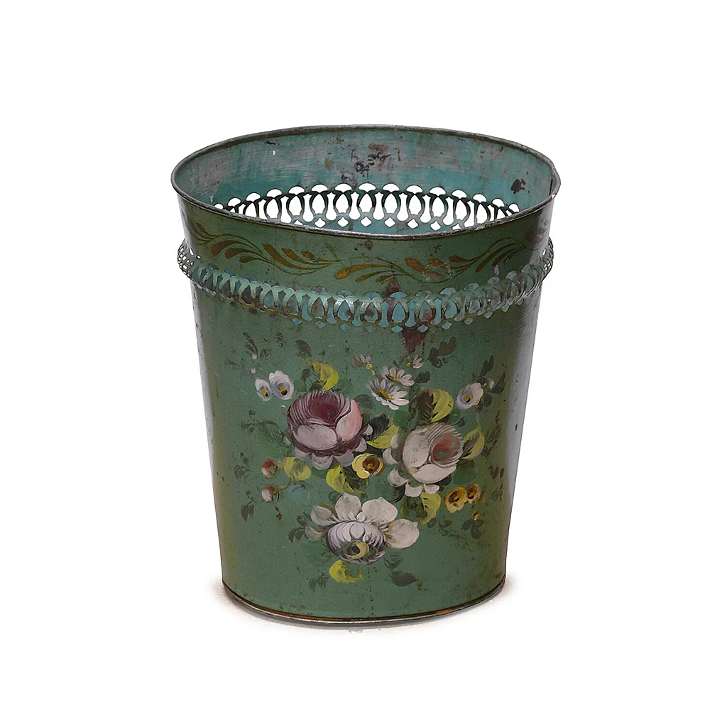 OVAL PALE GREEN DECORATED TOLL WASTE PAPER BIN WITH FRETTED RIM