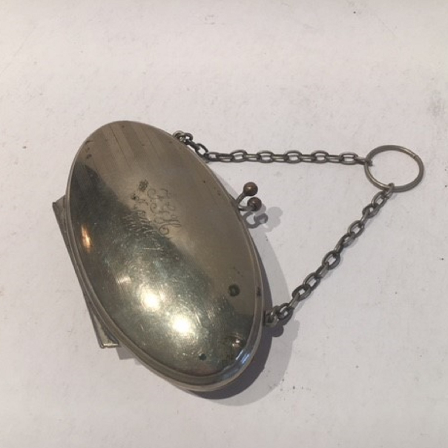 OVAL SILVER PLATED PURSE WITH BROWN FABRIC INTERIOR AND CHAIN HANDLE WITH LOOP