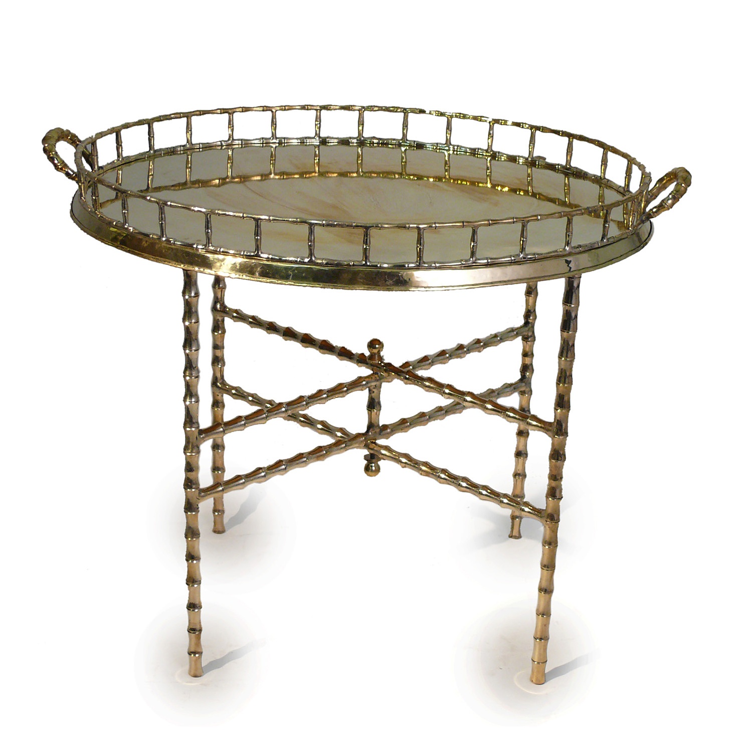OVAL TRAY TABLE GILT METAL FAUX BAMBOO FOLDING BASE 75 CM WIDE 52 CM DEEP 62 CM HIGH (X2)