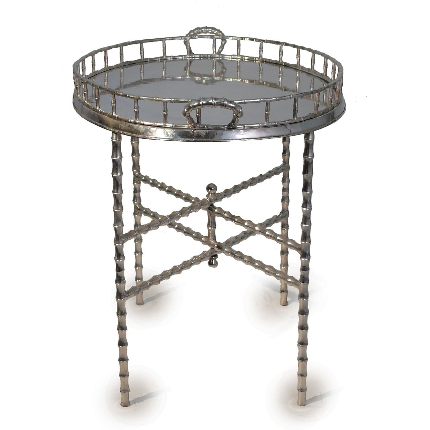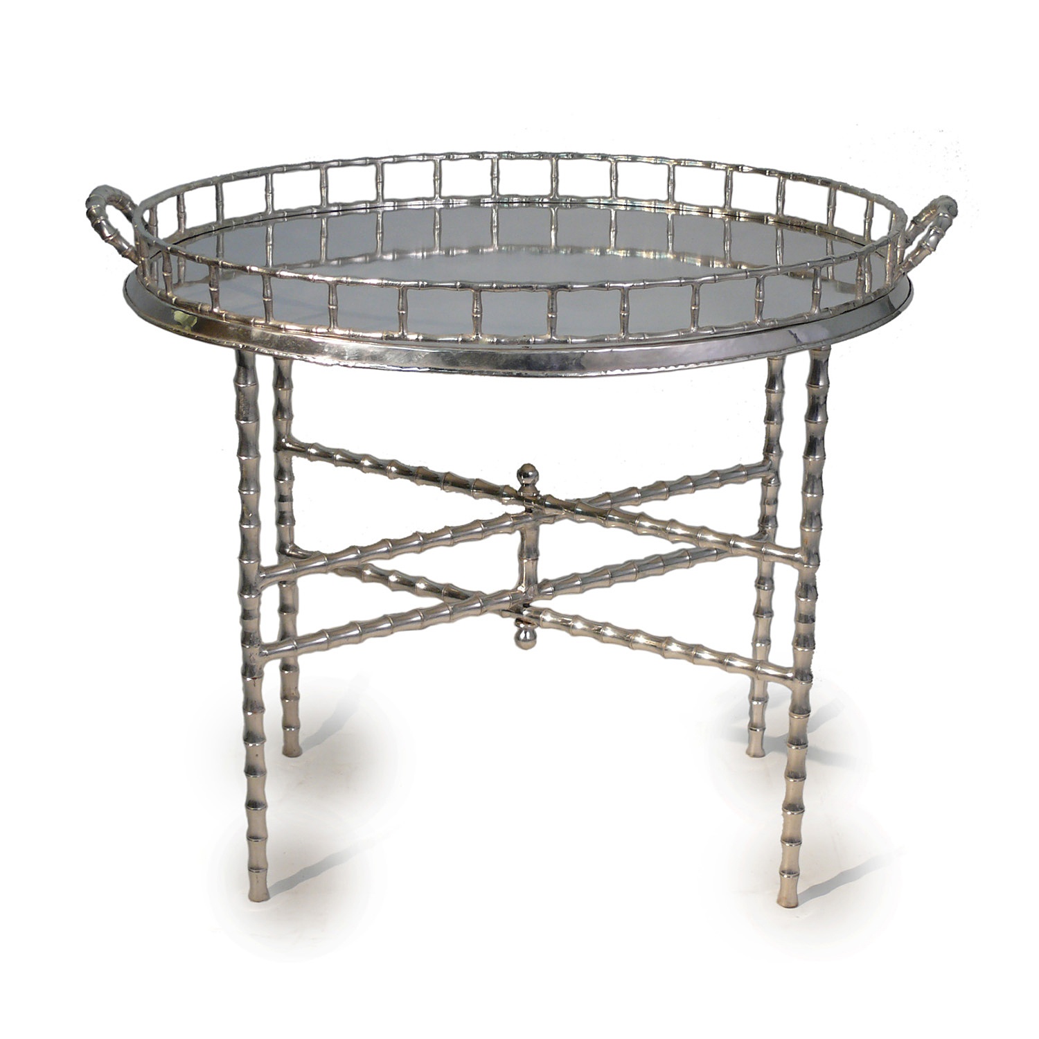 OVAL TRAY TABLE SILVER FAUX BAMBOO WITH FOLDING BASE 61 CM HIGH 76 CM WIDE 51.5 CM DEEP (X2)