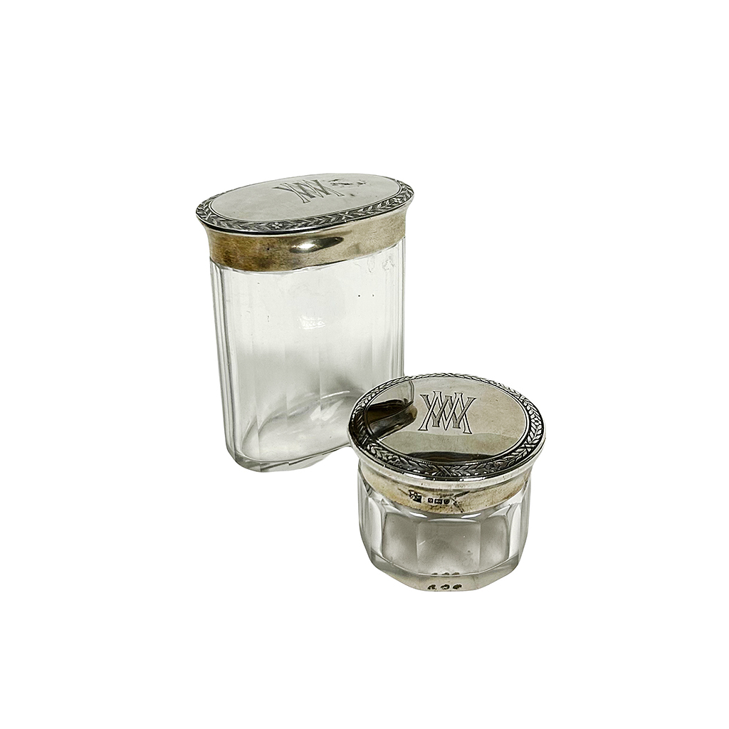 PAIR OF 1 X OVAL AND 1 X CIRCULAR TOILET POT / CONTAINER WITH MONOGRAMMED SILVER LID AND ENGRAVED LEAF BORDER DECORATION