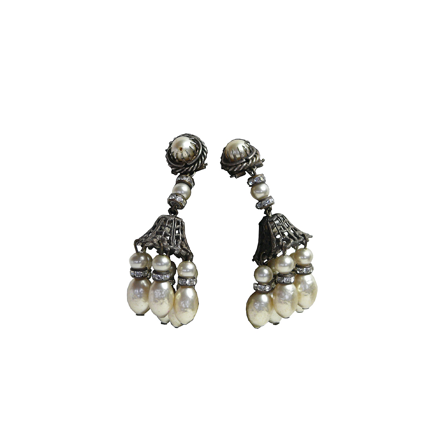 PAIR OF FRENCH SIX PEARL DROP EARINGS WITH GILT METAL AND DIAMANTE MOUNTS