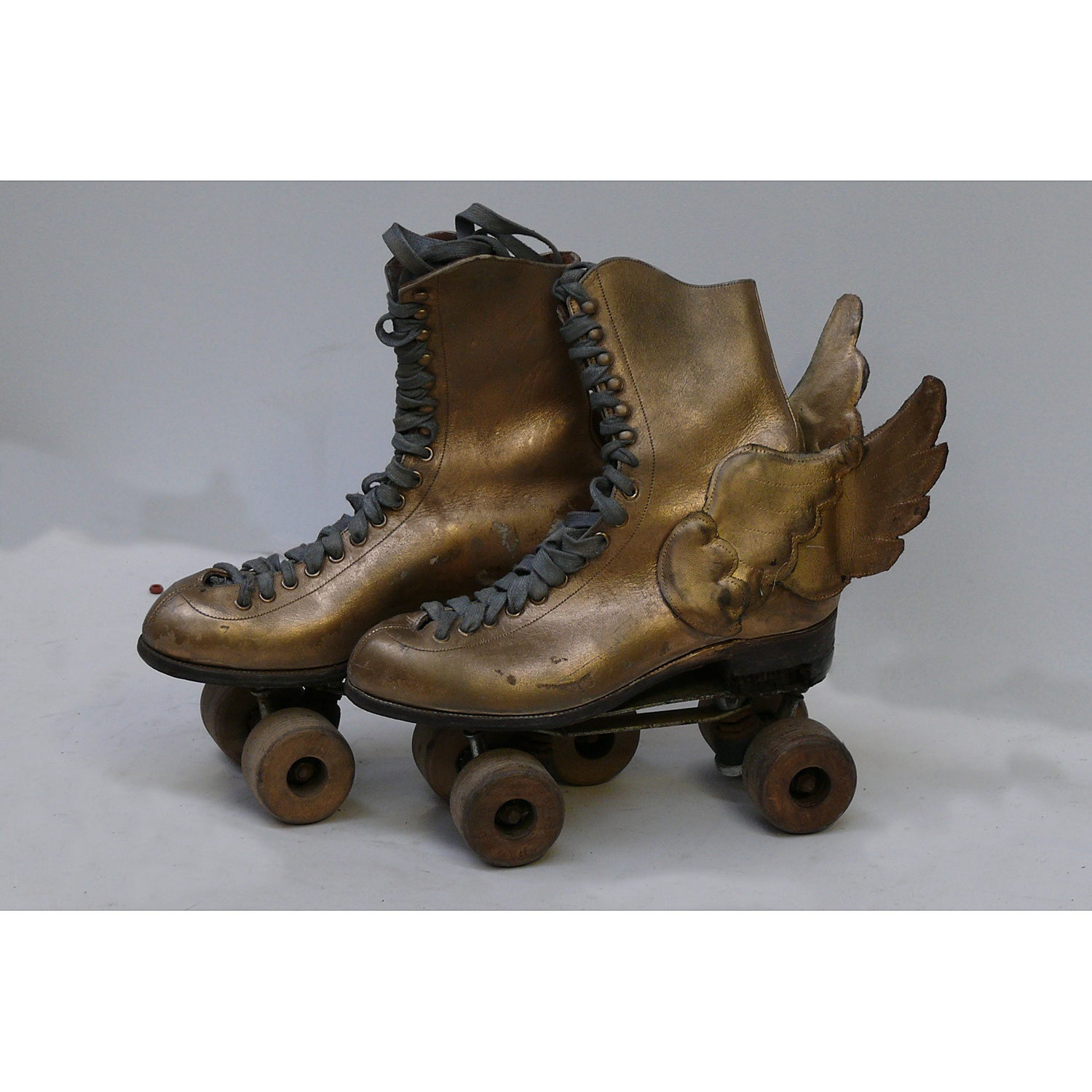 PAIR OF GOLD PAINTED ROLLER SKATES / BOOTS WITH WINGS