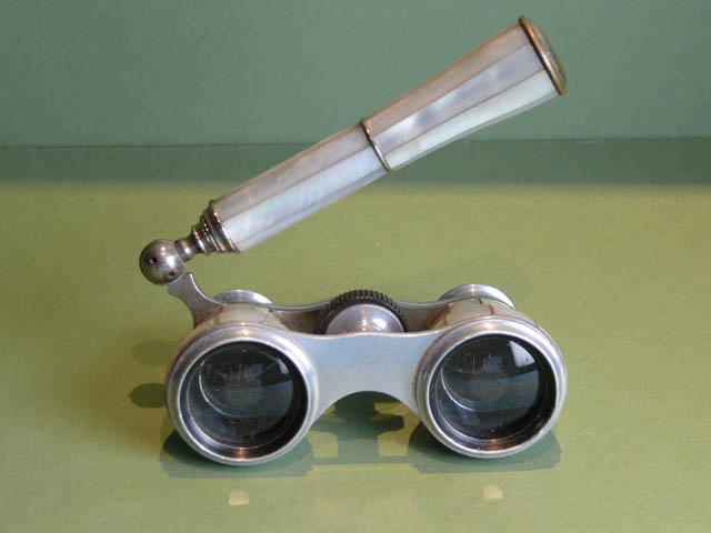 PAIR OF MOTHER OF PEARL AND BRASS OPERA GLASSES WITH SIDE HANDLE 16 CM WIDE (SOME DAMAGE)