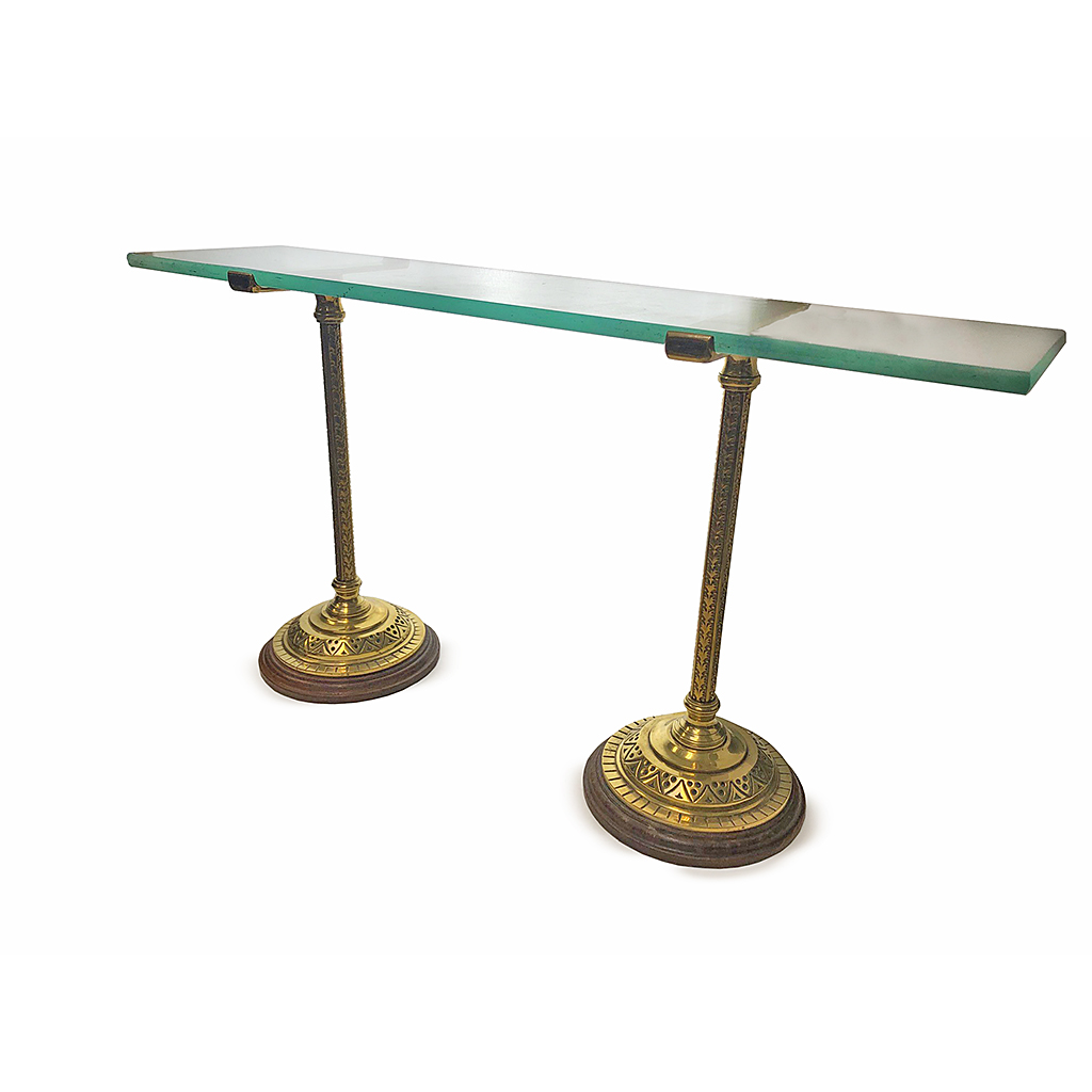 PAIR OF PATTERNED BRASS SHOP DISPLAY STANDS WITH PLATE GLASS SHELF CIRCA 1890 33 CM HIGH 61 CM LONG 16 CM WIDE