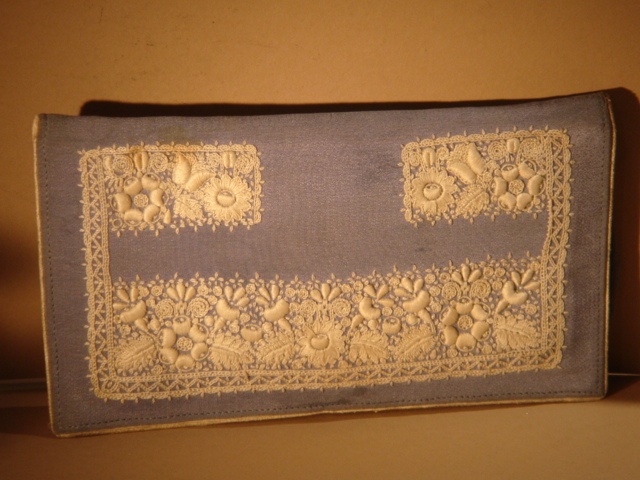 PALE BLUE AND WHITE NEEDLEWORK CLUTCH HANDBAG 22 CM WIDE
